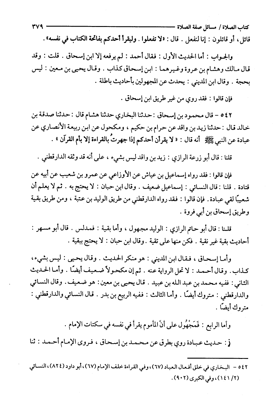 452 - قال محمود بن إسحاق : حدثنا البخاري حدثنا هشام قال : حدثنا صدقة بن خالد قال : حدثنا زيد بن واقد عن حرام بن حكيم ، ومكحول عن ابن ربيعة الأنصاري عن عبادة عن النبي أنه قال : ( ( لا يقرأن أحدكم إذا جهرت بالقراءة إلا بأم القرآن ) ) .