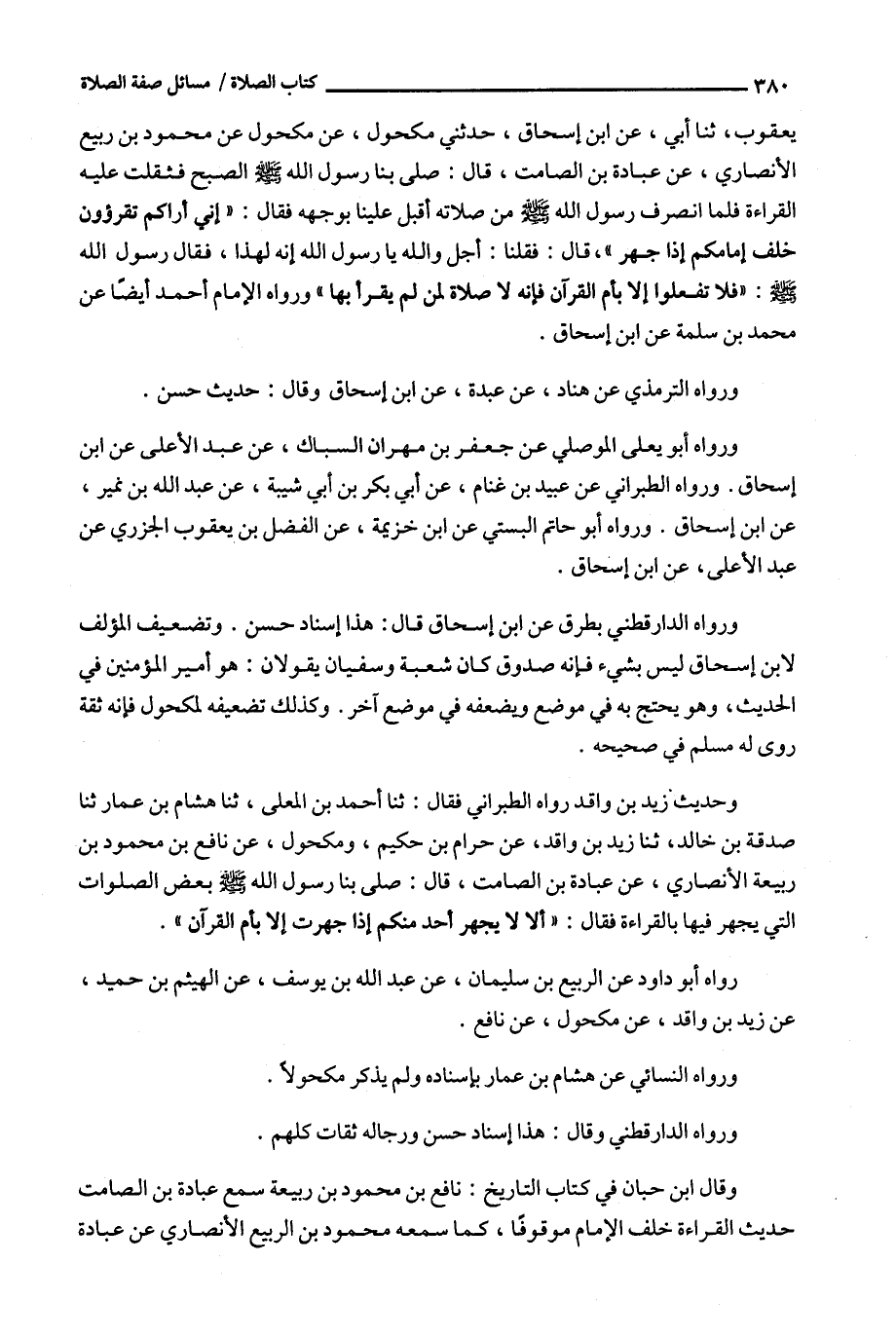 يعقوب ، ثنا أبي ، عن ابن إسحاق ، حدثني مكحول ، عن مكحول عن محمود بن ربيع الأنصاري ، عن عبادة بن الصامت ، قال : صلى بنا رسول الله الصبح فثقلت عليه القراءة فلما انصرف رسول الله من صلاته أقبل علينا بوجهه فقال : ( ( إني أراكم تقرؤون خلف إمامكم إذا جهر ) ) ، قال : فقلنا : أجل والله يا رسول الله إنه لهذا ، فقال رسول الله ( ( فلا تفعلوا إلا بأم القرآن فإنه لا صلاة لمن لم يقرأ بها ) ) ورواه الإمام أحمد أيضا عن محمد بن سلمة عن ابن إسحاق .