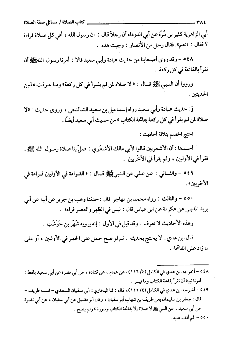 548 - وقد روى أصحابنا من حديث عبادة و أبي سعيد قالا : أمرنا رسول الله أن نقرأ بالفاتحة في كل ركعة .