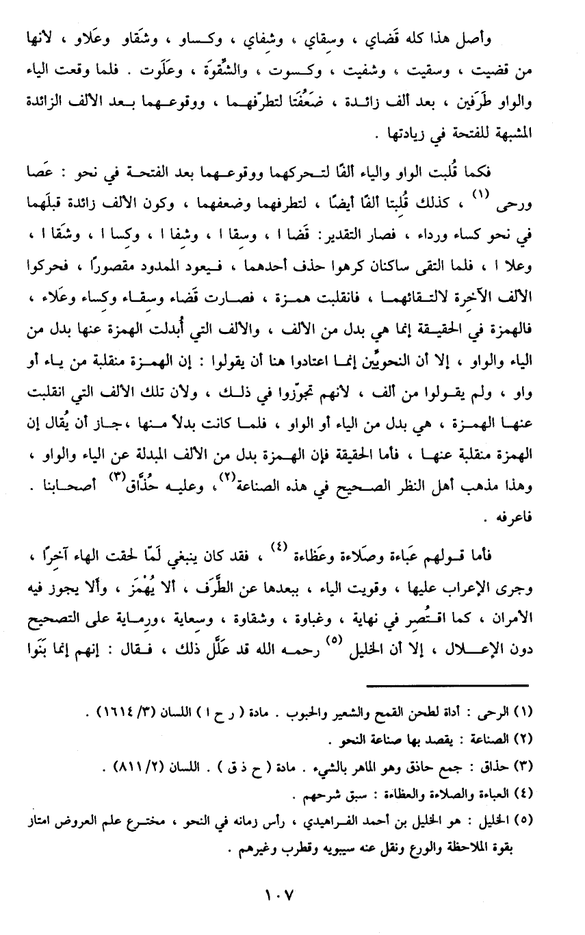 فأما قولهم عباءة وصلاءة وعظاءة4، فقد كان ينبغي لما لحقت الهاء آخرا، وجرى الإعراب عليها، وقويت الياء، بعدها عن الطرف، ألا يهمز، وألا يجوز فيه الأمران، كما اقتصر في نهاية، وغباوة، وشقاوة، وسعاية، ورماية على التصحيح دون الإعلال، إلا أن الخليل5 رحمه الله قد علل ذلك، فقال: إنهم إنما بنوا