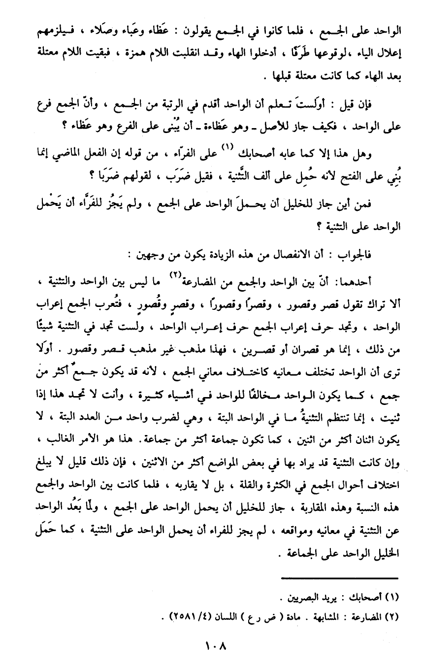 أحدهما: أن بين الواحد والجمع من المضارعة2 ما ليس بين الواحد والتثنية، ألا تراك تقول قصر وقصور، وقصرا وقصورا، وقصر وقصور، فتعرب الجمع إعراب الواحد، وتجد حرف إعراب الجمع حرف إعراب الواحد، ولست تجد في التثنية شيئا من ذلك، إنما هو قصران أو قصرين، فهذا مذهب غير مذهب قصر وقصور، أولا ترى أن الواحد تختلف معانيه كاختلاف معاني الجمع، لكنه قد يكون جمع أكثر من جمع، كما يكون الواحد مخالفا للواحد في أشياء كثيرة، وأنت لا تجد هذا إذا ثنيت، إنما تنتظم التثنية ما في الواحد التبة، وهي لضرب واحد من العدد البتة، لا يكون اثنان أكثر من اثنين، كما تكون جماعة أكثر من جماعة، ها هو الأمر الغالب، وإن كانت التثنية قد يراد بها في بعض المواضع أكثر من الاثنين، فإن ذلك قليل لا يبلغ اختلاف أحوال الجمع في الكثرة والقلة، بل لا يقاربه، فلما كانت بين الواحد والجمع هذه النسبة وهذه المقاربة، جاز للخليل أن يحمل الواحد على الجمع، ولما بعد الواحد عن التثنية في معانيه ومواقعه، لم يجز للفراء أن يحمل الواحد على التثنية، كما حمل الخليل الواحد على الجماعة.