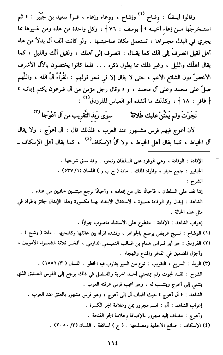 وقالوا أيضا: وشاح1 وإشاح، ووعاء وإعاء، قرأ سعيد بن جبير: "ثم استخرجها من إعاء أخيه" [يوسف: 76] ، وكل واحدة من هذه ومن غيرها مما يجري في البدل مجراها، تستعمل مكان صاحبتها، ولو كانت ألف آل بدلا من هاء أهل لقيل انصرف إلى آلك كما يقال: انصرف إلى أهلك، ولقيل آلك والليل، كما يقال أهلك والليل، وغير ذلك مما يطول ذكره ... فلما كانوا يختصون بالآل الأشرف الأخص دون الشائع الأعم، حتى لا يقال إلا في نحو قولهم: القراء آل الله، واللهم صل على محمد وعلى آل محمد، و {وَقَالَ رَجُلٌ مُؤْمِنٌ مِنْ آلِ فِرْعَوْنَ يَكْتُمُ إِيمَانَه} [غافر: 18] ، وكذلك ما أنشده أبو العباس للفرزدق2.