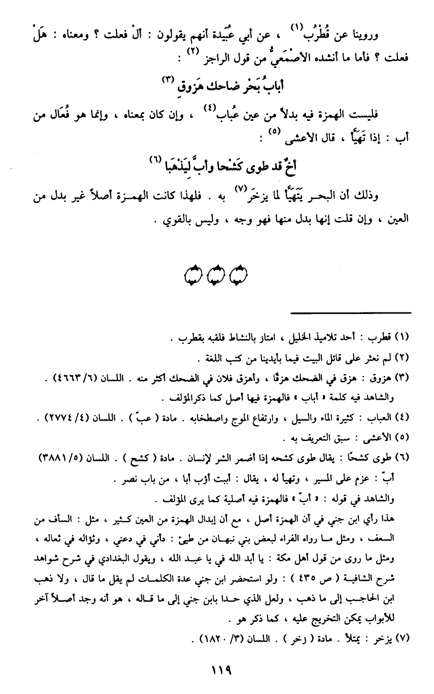 هذا رأي ابن جني في أن الهمزة أصل، مع أن إبدال الهمزة من العين كثير، مثل: السأف من السعف، ومثل ما رواه الفراء لبعض بني نبهان من طيئ: دأني في دعني، وثؤاله في ثعالة، ومثل ما روى من قول أهل مكة: يا أبد الله في يا عبد الله، ويقول البغدادي في شرح شواهد شرح الشافية "ص435": ولو استحضر ابن جني عدة الكلمات لم يقل ما قاله، ولا ذهب ابن الحاجب إلى ما ذهب، ولعل الذي حدا بابن جني إلى ما قاله، هو أنه وجد أصلا آخر للأبواب يمكن التخريج عليه، كما ذكر هو.