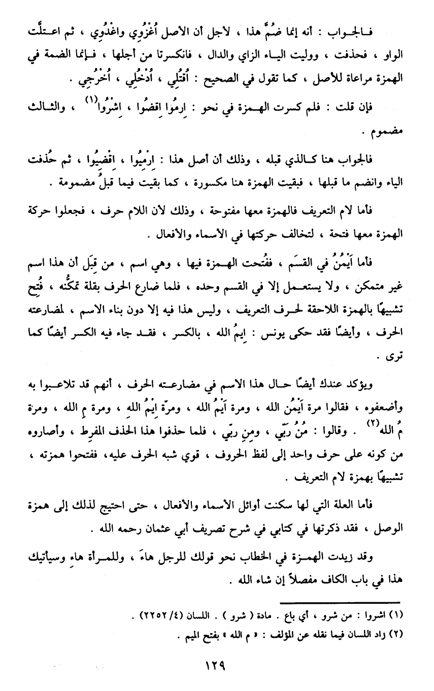 فالجواب: أنه إنما ضم هذا، لأجل أن الأصل اغزوي واغدوي، ثم اعتلت الواو، فحذفت، ووليت الياء الزاي والدال، فانكسرتا من أجلها، فإنما الضمة في الهمزة مراعاة للأصل، كما تقول في الصحيح: اقتلي، ادخلي، اخرجي.