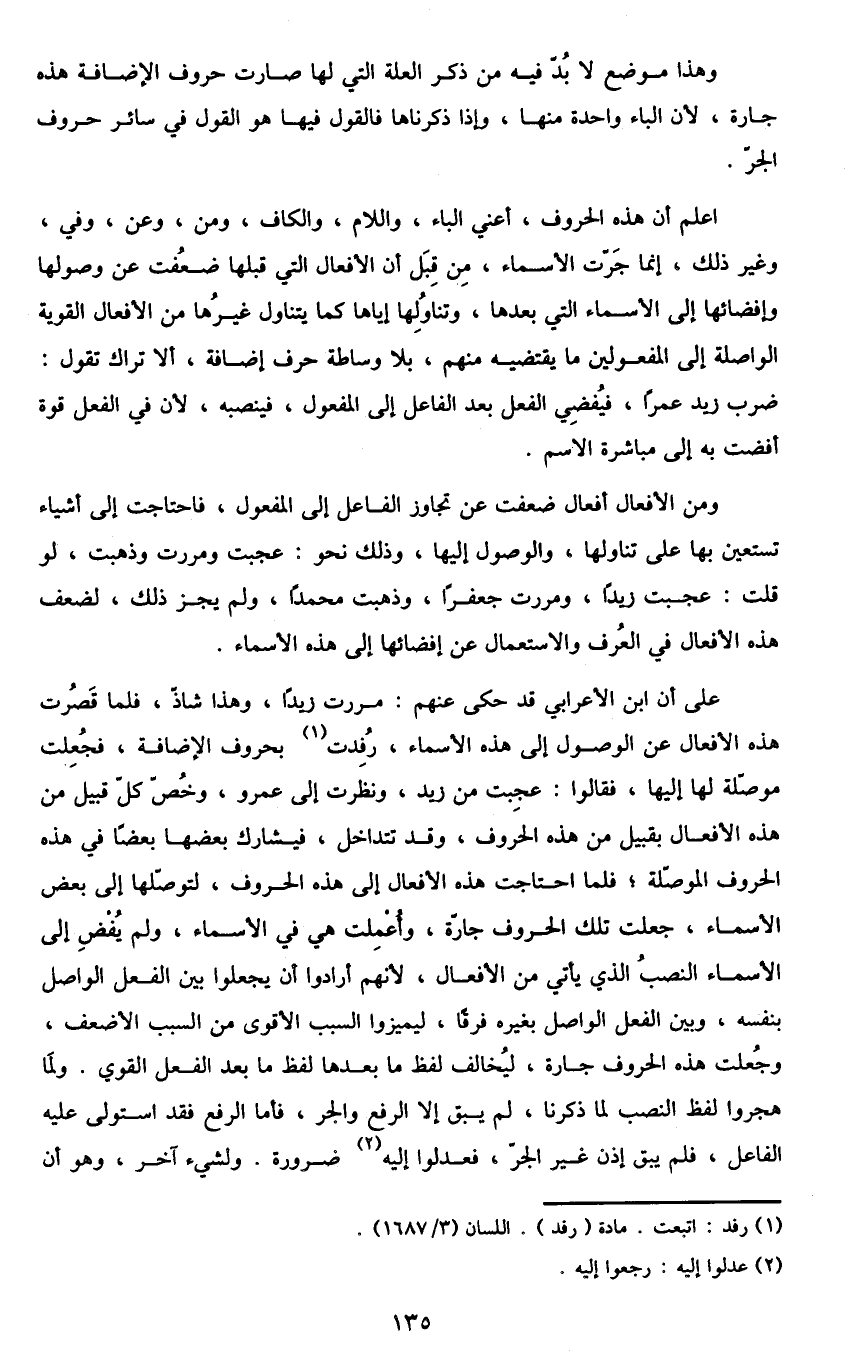 ومن الأفعال أفعال ضعفت عن تجاوز الفاعل إلى المفعول، فاحتاجت إلى أشياء تستعين بها على تناولها، والوصول إليها، وذلك نحو: عجبت ومررت وذهبت، لو قلت: عجبت زيدا، ومررت جعفرا، وذهبت محمدا، ولم يجز ذلك، لضعف هذه الأفعال في العرف والاستعمال عن إفضائها إلى هذه الأسماء.