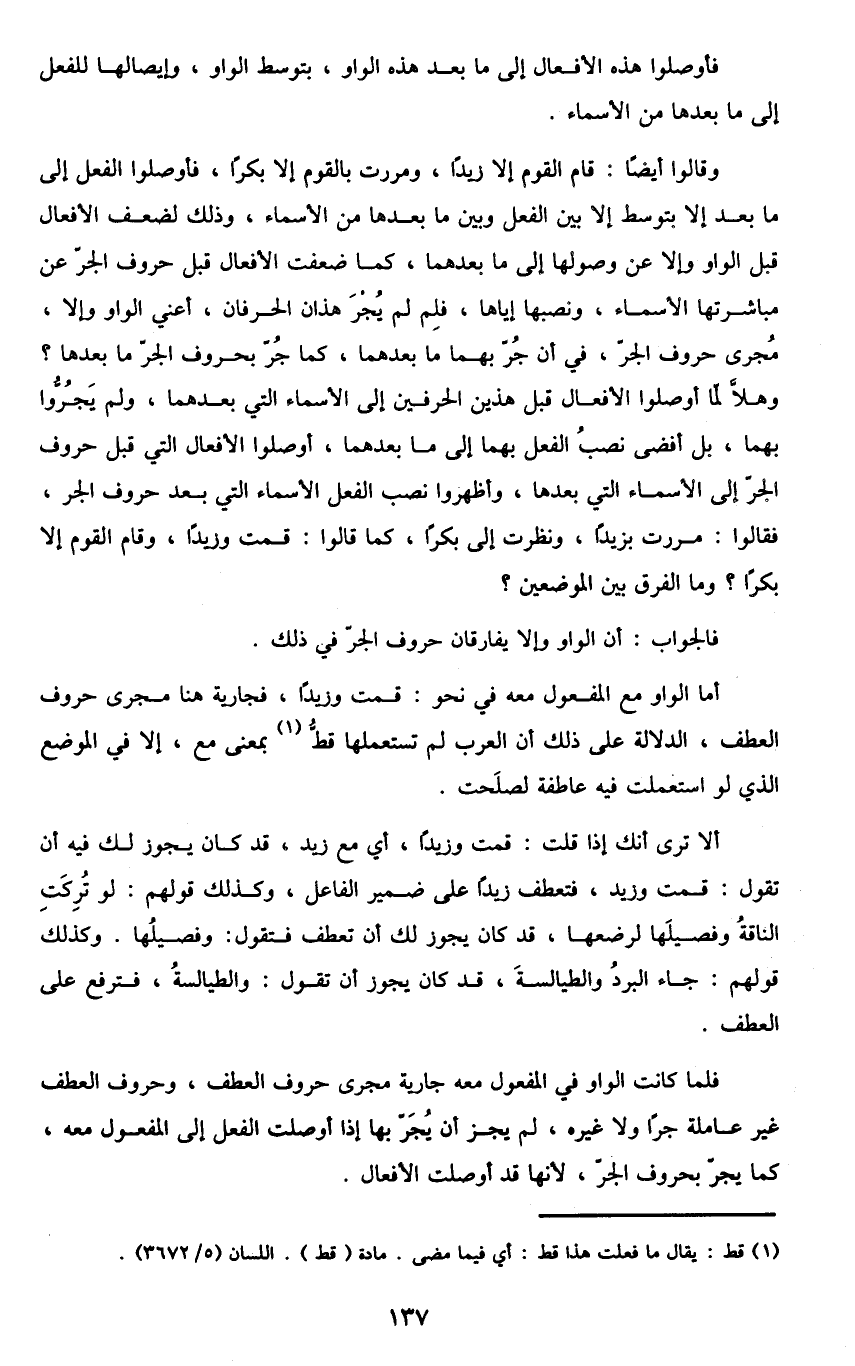 وقالوا أيضا: قام القوم إلا زيدا، ومررت بالقوم إلا بكرا، فأوصلوا الفعل إلى ما بعد ألا بتوسط إلا بين الفعل وبين ما بعدها من الأسماء، وذلك لضعف الأفعال قبل الواو وإلا عن وصولها إلى ما بعدهما، كما ضعفت الأفعال قبل حروف الجر عن مباشرتها الأسماء، ونصبها إياها، فلم لم يجر هذان الحرفان، أعني الواو وإلا، مجرى حروف الجر، في أن جر بهما ما بعدهما، كما جر بحروف الجر ما بعدها؟ وهلا لما أوصلوا الأفعال قبل هذين الحرفين إلى الأسماء التي بعدهما، ولم يجروا بهما، بل أفضى نصب الفعل بهما إلى ما بعدهما، أوصلوا الأفعال التي قبل حروف الجر إلى الأسماء التي بعدها، وأظهروا نصب الفعل الأسماء التي بعد حروف الجر، فقالوا: مررت بزيدا، ونظرت إلى بكرا، كما قالوا: قمت وزيدا، وقام القوم إلا بكرا؟ وما الفرق بين الموضعين؟
