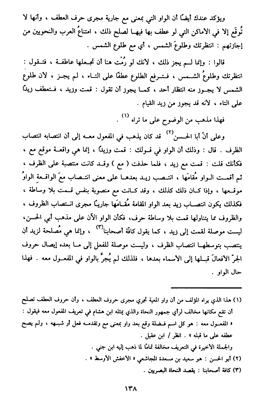 1 هذا الذي يراه المؤلف من أن واو المعية تجري مجرى حروف العطف، وأن حروف العطف تصلح أن تقع مكانها مخالف لرأي جمهور النحاة والذي يمثله ابن هشام في تعريف المفعول معه فيقول: "المفعول معه" وكل اسم فضل وقع بعد واو بمعنى مع وتقدمه فعل أو شبهه، ولم يصح عطفه على ما قبله". انظر/ ابن عقيل.