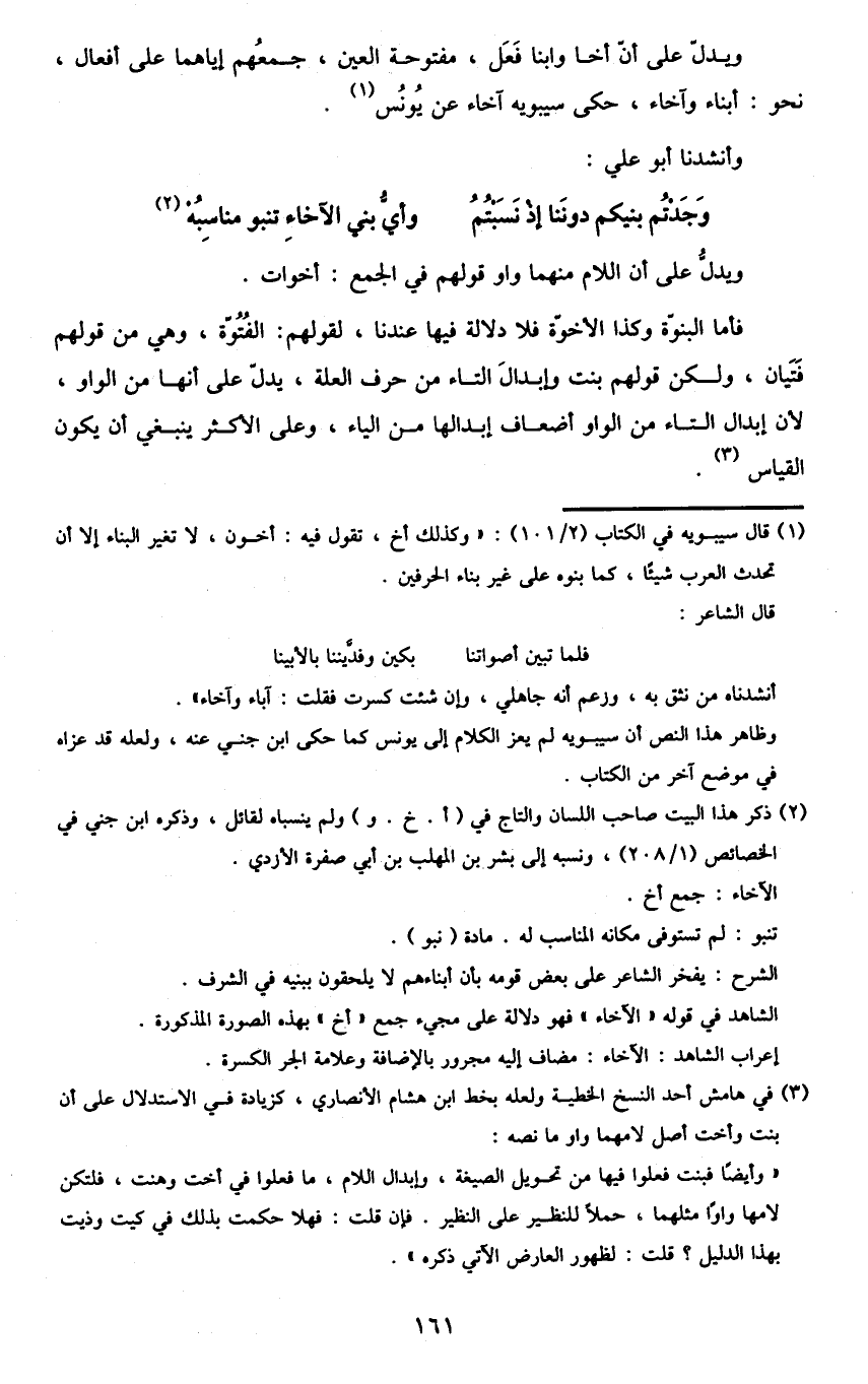 1 قال سيبويه في الكتاب "2/ 101": "وكذلك أخ، تقول فيه: أخون، لا تغير البناء إلا أن تحدث العرب شيئا، كما بنوه على غير بناء الحرفين.
