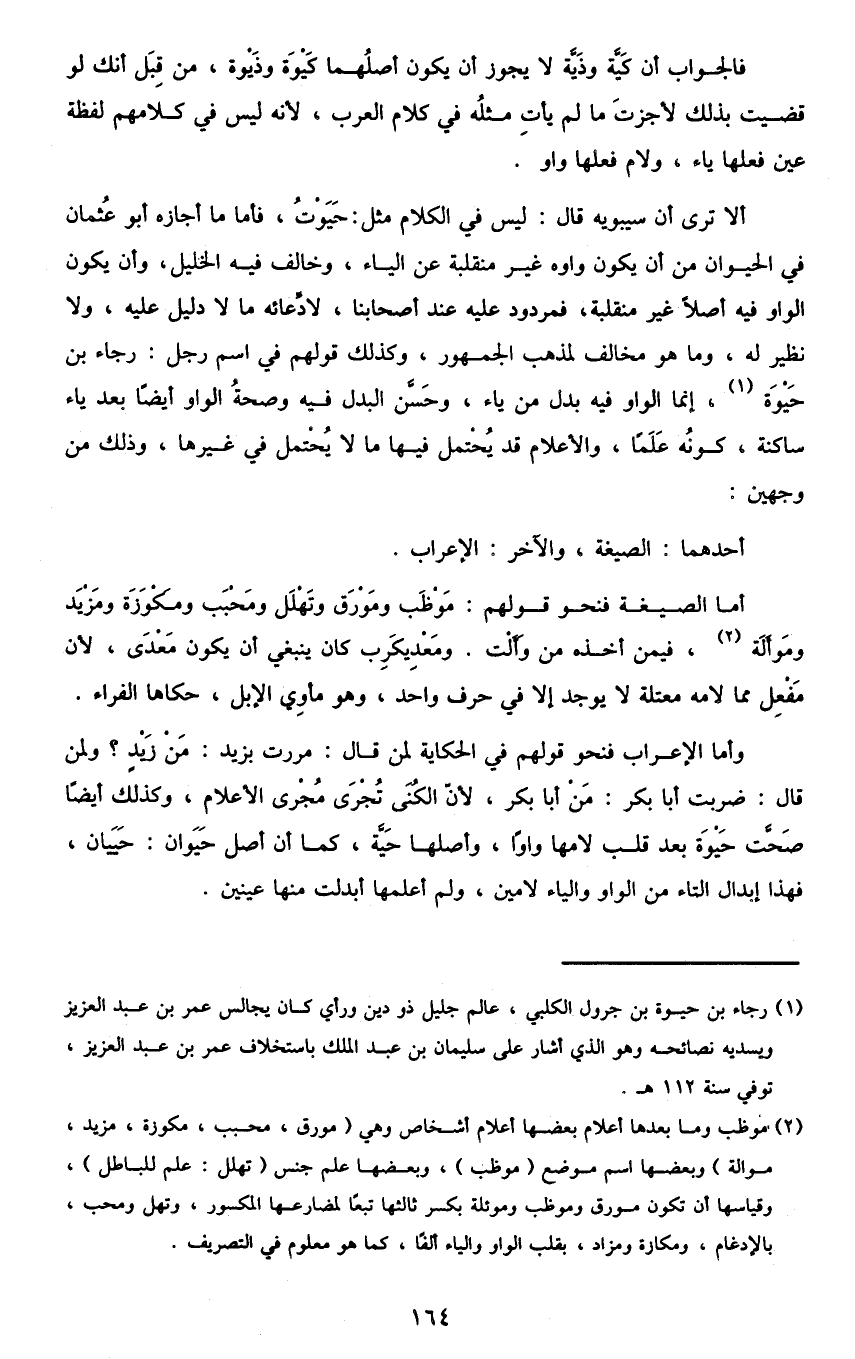 ألا ترى أن سيبويه قال: ليس في الكلام مثل: حيوت، فأما ما أجازه أبو عثمان في الحيوان من أن يكون واوه غير منقلبة عن الياء، وخالف فيه الخليل، وأن يكون الواو فيه أصلا غير منقلبة، فمردود عليه عند أصحابنا لادعائه ما لا دليل عليه، ولا نظير له، وما هو مخالف لمذهب الجمهور، وكذلك قولهم في اسم رجل: رجاء بن حيوة1، إنما الواو فيه بدل من ياء، وحسن البدل فيه وصحة الواو أيضا بعد ياء ساكنة، كونه علما، والأعلام قد يحتمل فيها ما لا يحتمل في غيرها، وذلك من وجهين: