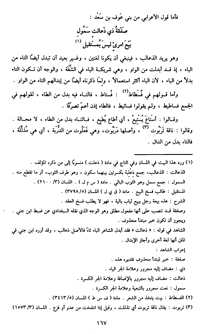 وهو يريد الذعالب، فينبغي أن يكونا لغتين، وغير بعيد أن تبدل أيضا التاء من الباء، إذ قد أبدلت من الواو، وهي شريكة الباء في الشفة، والوجه أن تكون التاء بدلا من الباء، لأن الباء أكثر استعمالا، ولما ذكرناه أيضا من إبدالهم التاء من الواو.