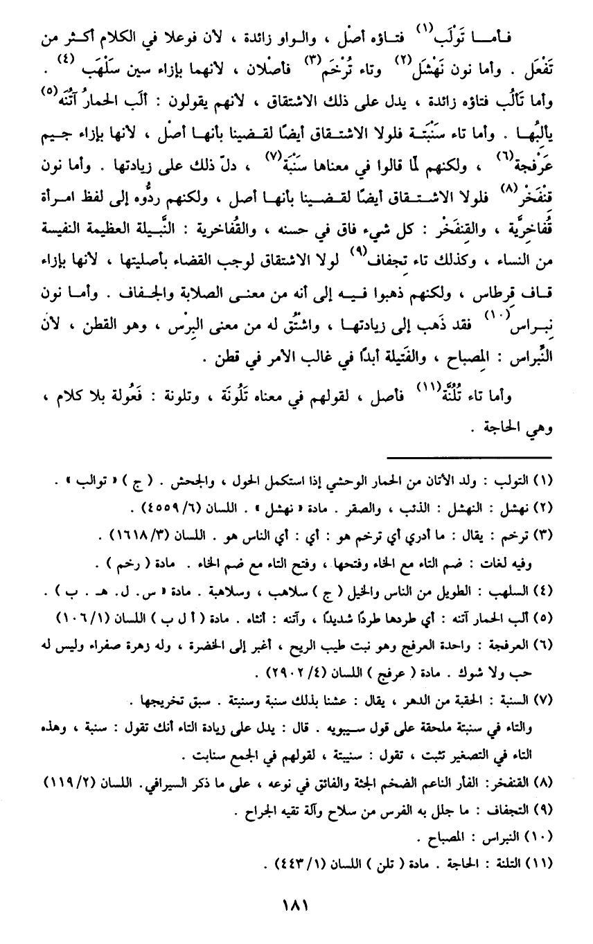 فأما تولب1 فتاؤه أصل، والواو زائدة، لأن فوعلا في الكلام أكثر من تفعل. وأما نون نهشل2 وتاء ترخم3 فأصلان، لأنهما بإزاء سين سلهب4. وأما تألب فتاؤه زائدة، يدل على ذلك الاشتقاق، لأنهم يقولون: ألب الحمار آتنه5 يألبها. وأما تاء سنبتة فلولا الاشتقاق أيضا لقضينا بأنها أصل، لأنها بإزاء جيم عرفجة6 ولكنهم لما قالوا في معناها سنبة7، دل ذلك على زيادتها. وأما نون قنفخر8 فلولا الاشتقاق أيضا لقضينا بأنها أصل، ولكنهم ردوه إلى لفظ امرأة قفاخرية، والقنفخر: كل شيء فاق في حسنه، والقفاخرية: النبيلة العظيمة النفيسة من النساء، وكذلك تاء تجفاف9 لولا الاشتقاق لوجب القضاء بأصليتها، لأنها بإزاء قاف قرطاس، ولكنهم ذهبوا فيه إلى أنه من معنى الصلابة والجفاف. وأما نون نبراس10 فقد ذهب إلى زيادتها، واشتق له من معنى البرس، وهو القطن، لأن النبراس: المصباح، والفتيلة أبدا في غالب الأمر في قطن.