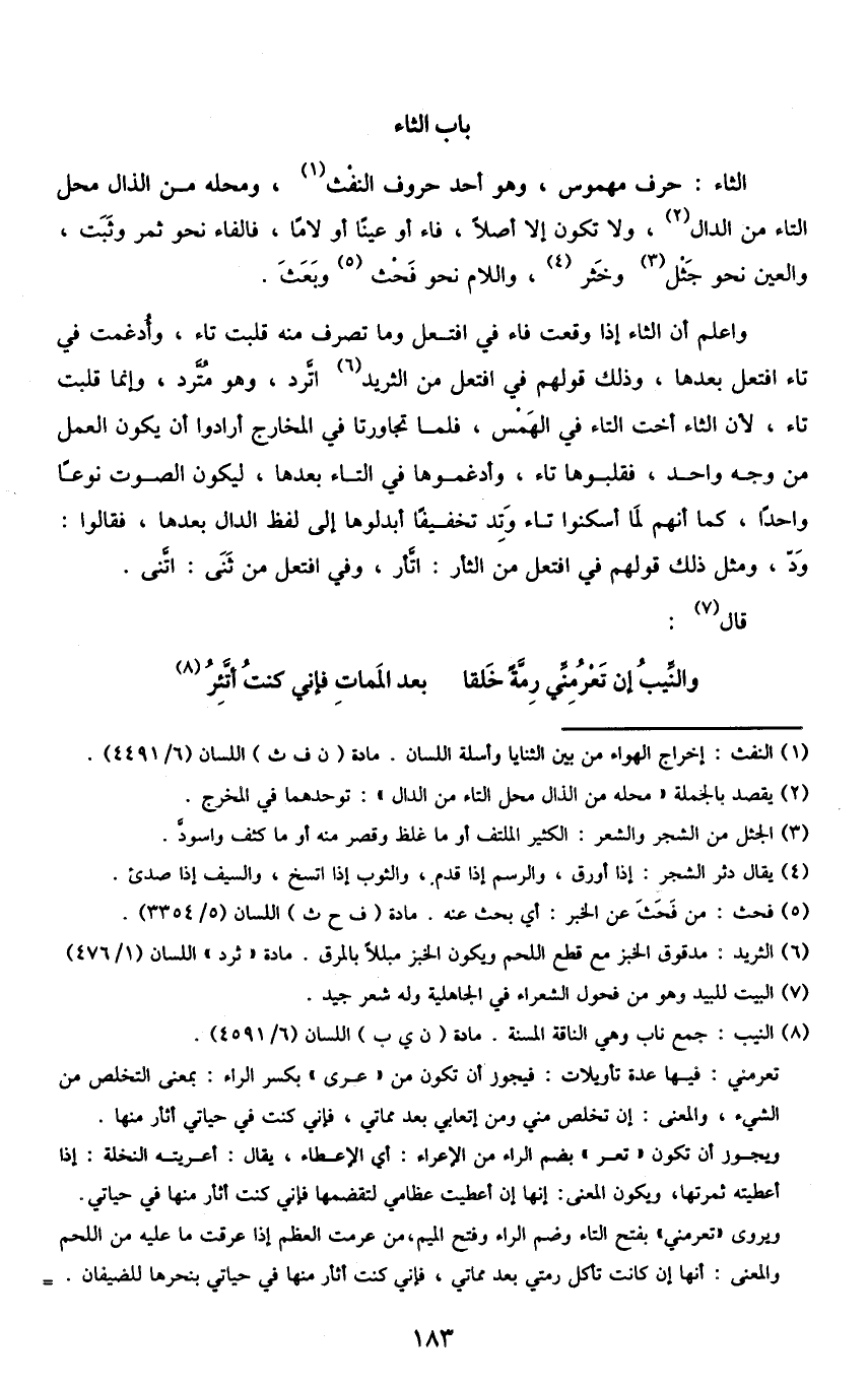 الثاء: حرف مهموس، وهو أحد حروف النفث1، ومحله من الذال محل التاء من الدال2، ولا تكون إلا أصلا، فاء أو عينا أو لاما، فالفاء نحو ثمر وثبت، والعين نحو جثل3 وخثر4، واللام نحو فحث5 وبعث.