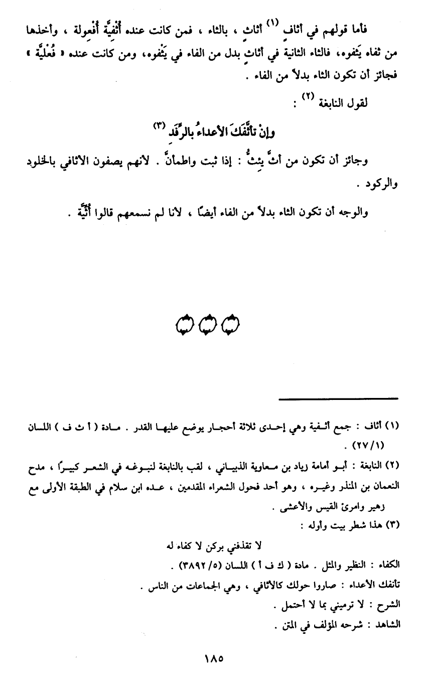 فأما قولهم في أثاف1 أثاث، بالثاء فمن كانت عنده أثفية أفعولة، وأخذها من ثفاه يثفوه، فالثاء الثانية في أثاث بدل من الفاء في يثفوه، ومن كانت عنده "فعلية" فجائز أن تكون الثاء بدلا من الفاء.