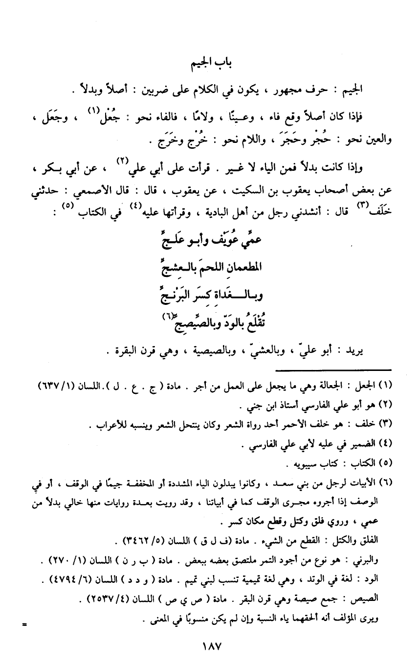 6 الأبيات لرجل من بني سعد، وكانوا يبدلون الياء المشددة أو المخففة جيما في الوقف، أو في الوصف إذا أجروه مجرى الوقف كما في أبياتنا، وقد رويت بعدة روايات منها خالي بدلا من عمي، وروي فلق وكتل وقطع مكان كسر.