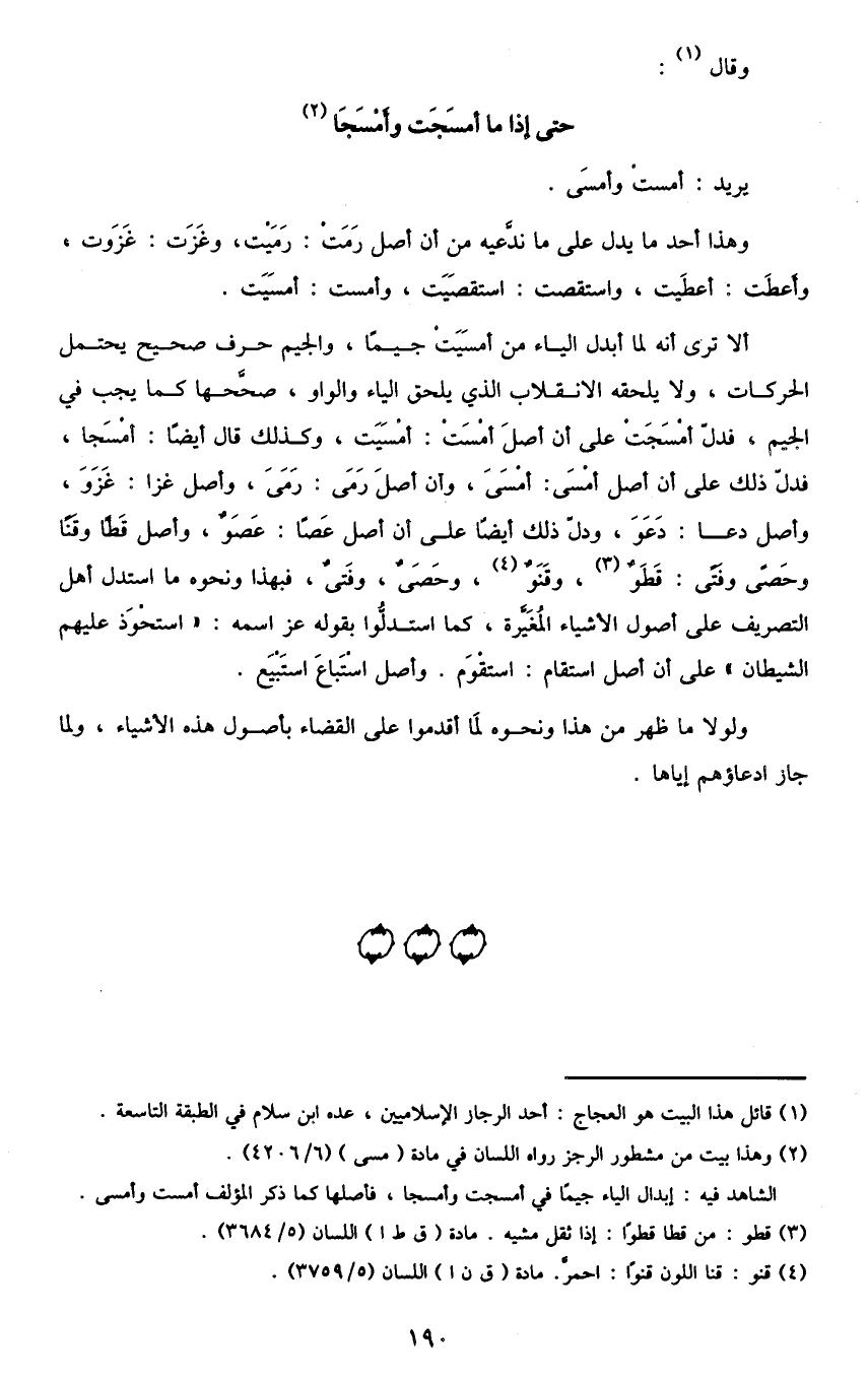 ألا ترى أنه لما أبدل الياء من أمسيت جيما، والجيم حرف صحيح يحتمل الحركات، ولا يلحقه الانقلاب الذي يلحق الياء والواو، صححها كما يجب في الجيم، فدل أمسجت على أن أصل أمست: أمسيت، وكذلك قال أيضا: أمسجا، فدل ذلك على أن أصل أمسى: أمسي، وأن أصل رمى: رمي، وأصل غزا: غزو، وأصل دعا: دعو، ودل ذلك أيضا على أن أصل عصا: عصو، وأصل قطا وقنا وحصى وفتى: قطو3، وقنو4، وحصي، وفتي، فبهذا ونحوه ما استدل أهل التصريف على أصول الأشياء المغيرة، كما استدلوا بقوله عز اسمه: {اسْتَحْوَذَ عَلَيْهِمُ الشَّيْطَان} على أن أصل استقام: استقوم. وأصل استباع استبيع.