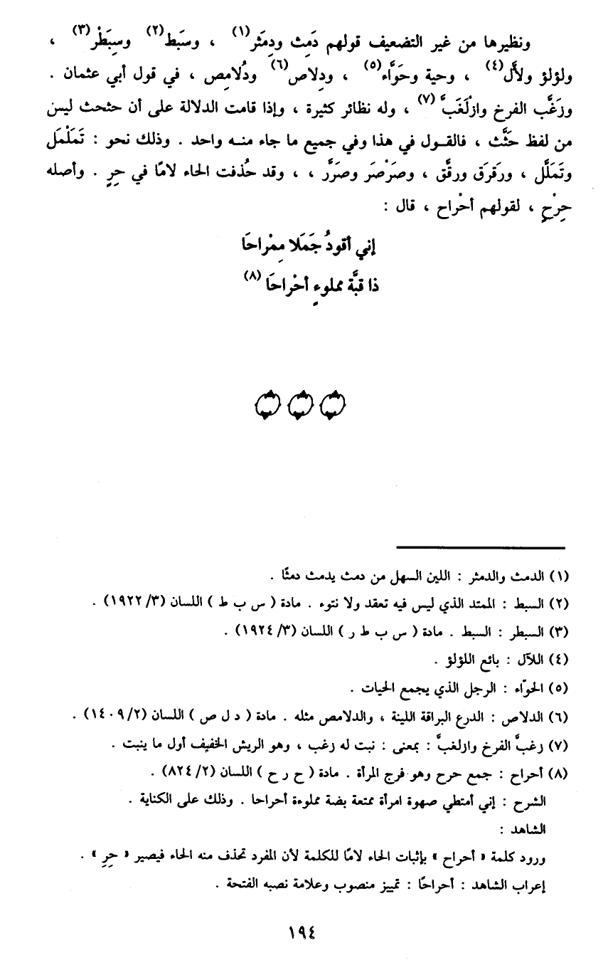 ونظيرها من غير التضعيف قولهم دمث ودمثر1، وسبط2 وسبطر3، ولؤلؤ ولأل4، وحية وحواء5، ودلاص6 ودلامص، في قول أبي عثمان. وزغب الفرخ وازلغب7، وله نظائر كثيرة، وإذا قامت الدلالة على أن حثحث ليس من لفظ حثث، فالقول في هذا وفي جميع ما جاء منه واحد، وذلك نحو: تململ وتملل، ورقرق ورقق، وصرصر وصرر، وقد حذفت الحاء لاما في حر. وأصله حرح، لقولهم أحراح، قال: