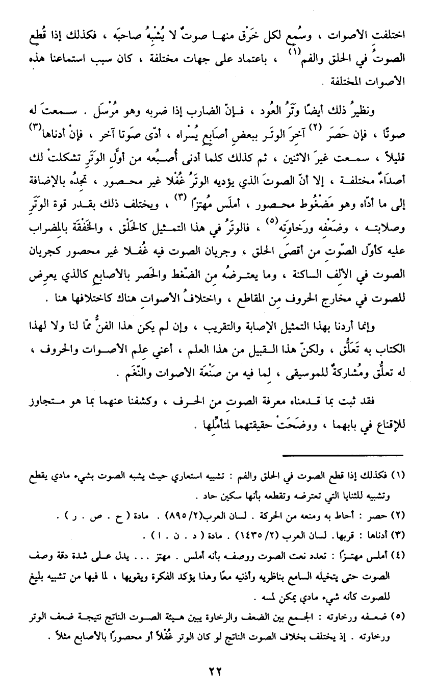 وإنما أردنا بهذا التمثيل الإصابة والتقريب، وإن لم يكن هذا الفن مما لنا ولا لهذا الكتاب به تعلق، ولكن هذا القبيل من هذا العلم، أعني علم الأصوات والحروف، له تعلق ومشاركة للموسيقى، لما فيه من صنعة الأصوات والنغم.