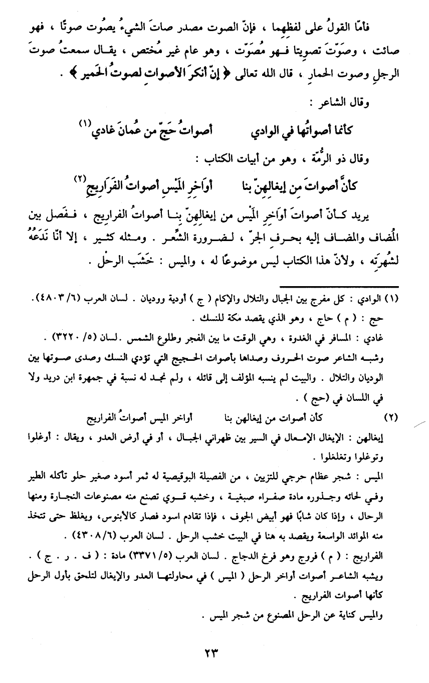 غادي: المسافر في الغدوة، وهي الوقت ما بين الفجر وطلوع الشمس. لسان "5/ 3220" وشبه الشاعر صوت الحروف وصداها بأصوات الحجيج التي تؤدي النسك وصدى صوتها بين الوديان والتلال. والبيت لم ينسبه المؤلف إلى قائله، ولم نجد له نسبة في جمهرة ابن دريد ولا في اللسان في "حج".