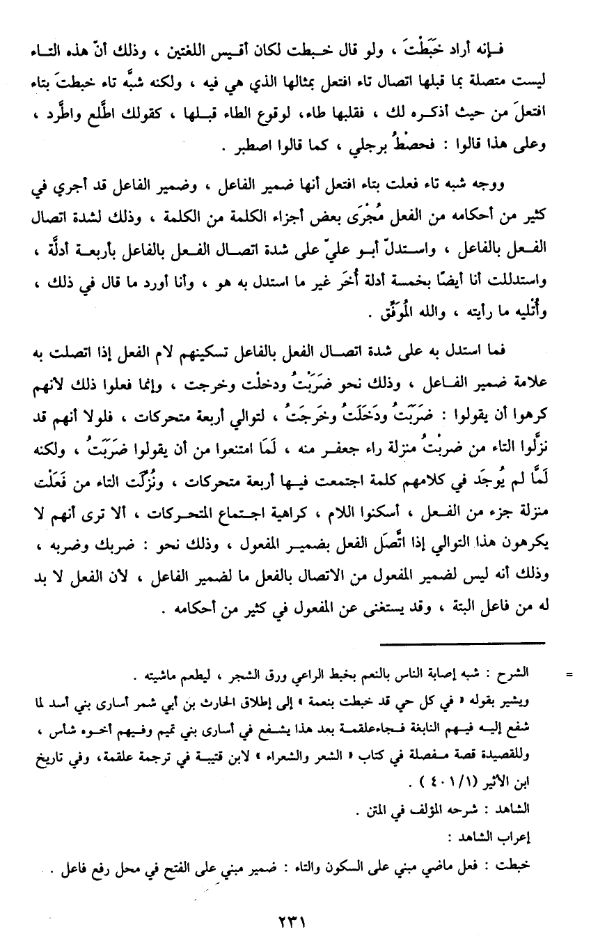 ووجه شبه تاء فعلت بتاء افتعل أنها ضمير الفاعل، وضمير الفاعل قد أجري في كثير من أحكامه من الفعل مجرى بعض أجزاء الكلمة من الكلمة، وذلك لشدة اتصال الفعل بالفاعل، واستدل أبو علي على شدة اتصال الفعل بالفاعل بأربعة أدلة، واستدللت أنا أيضا بخمسة أدلة أخر غير ما استدل به هو، وأنا أورد ما قال في ذلك، وأتليه ما رأيته، والله الموفق.