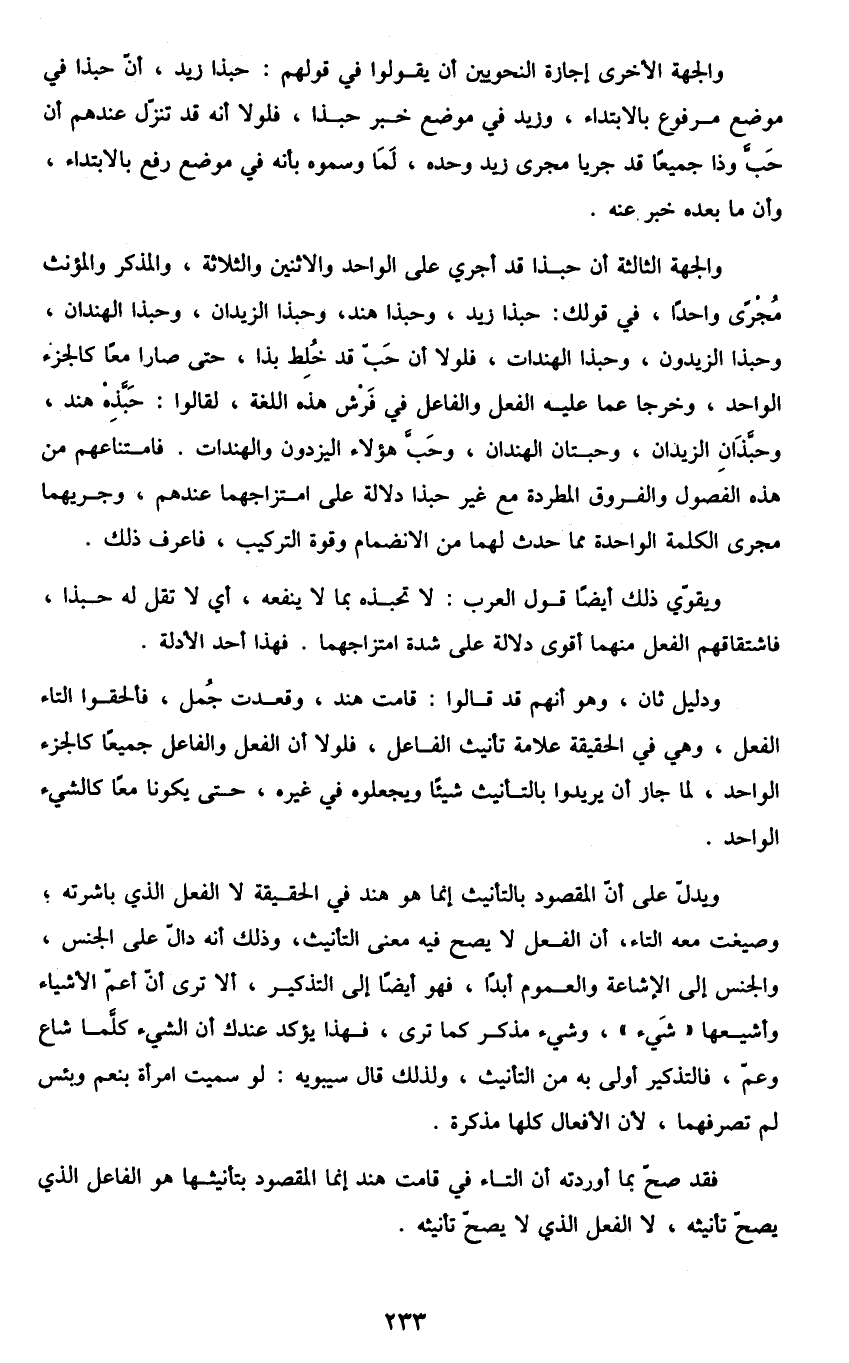 والجهة الثالثة أن حبذا قد أجري على الواحد والاثنين والثلاثة، والمذكر والمؤنث مجرى واحدا، في قولك: حبذا زيد، وحبذا هند، وحبذا الزيدان، وحبذا الهندان، وحبذا الزيدون، وحبذا الهندات، فلولا أن حب قد خلط بذا، حتى صارا معا كالجزء الواحد، وخرجا عما عليه الفعل والفاعل في فرش هذه اللغة، لقالوا: حبذه هند، وحبذان الزيادان، وحبتان الهندان، وحب هؤلاء الزيدون والهندات. فامتناعهم من هذه الفصول والفروق المطردة مع غير حبذا دلالة على امتزاجهما عندهم، وجريهما مجرى الكلمة الواحدة مما حدث لهما من الانضمام وقوة التركيب، فاعرف ذلك.