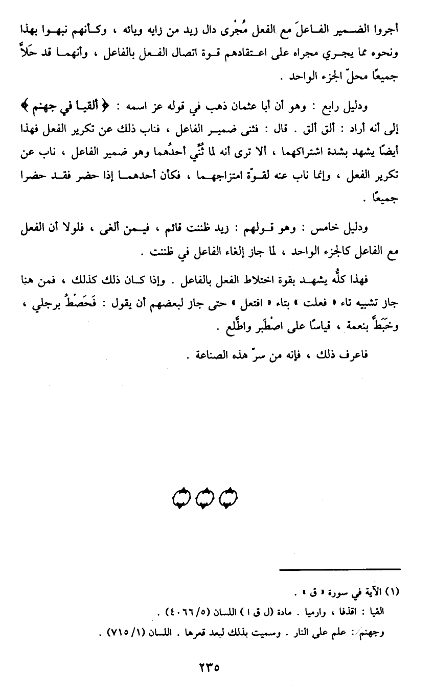 ودليل رابع: وهو أن أبا عثمان ذهب في قوله عز اسمه: {أَلْقِيَا فِي جَهَنَّم} 1 إلى أنه أراد: ألق ألق. قال. فثنى ضمير الفاعل، فناب ذلك عن تكرير الفعل فهذا أيضا يشهد بشدة اشتراكهما، ألا ترى أنه لما ثنى أحدهما وهو ضمير الفاعل، ناب عن تكرير الفعل، وإنما ناب عنه لقوة امتزاجهما، فكأن أحدهما إذا حضر فقد حضرا جميعا.