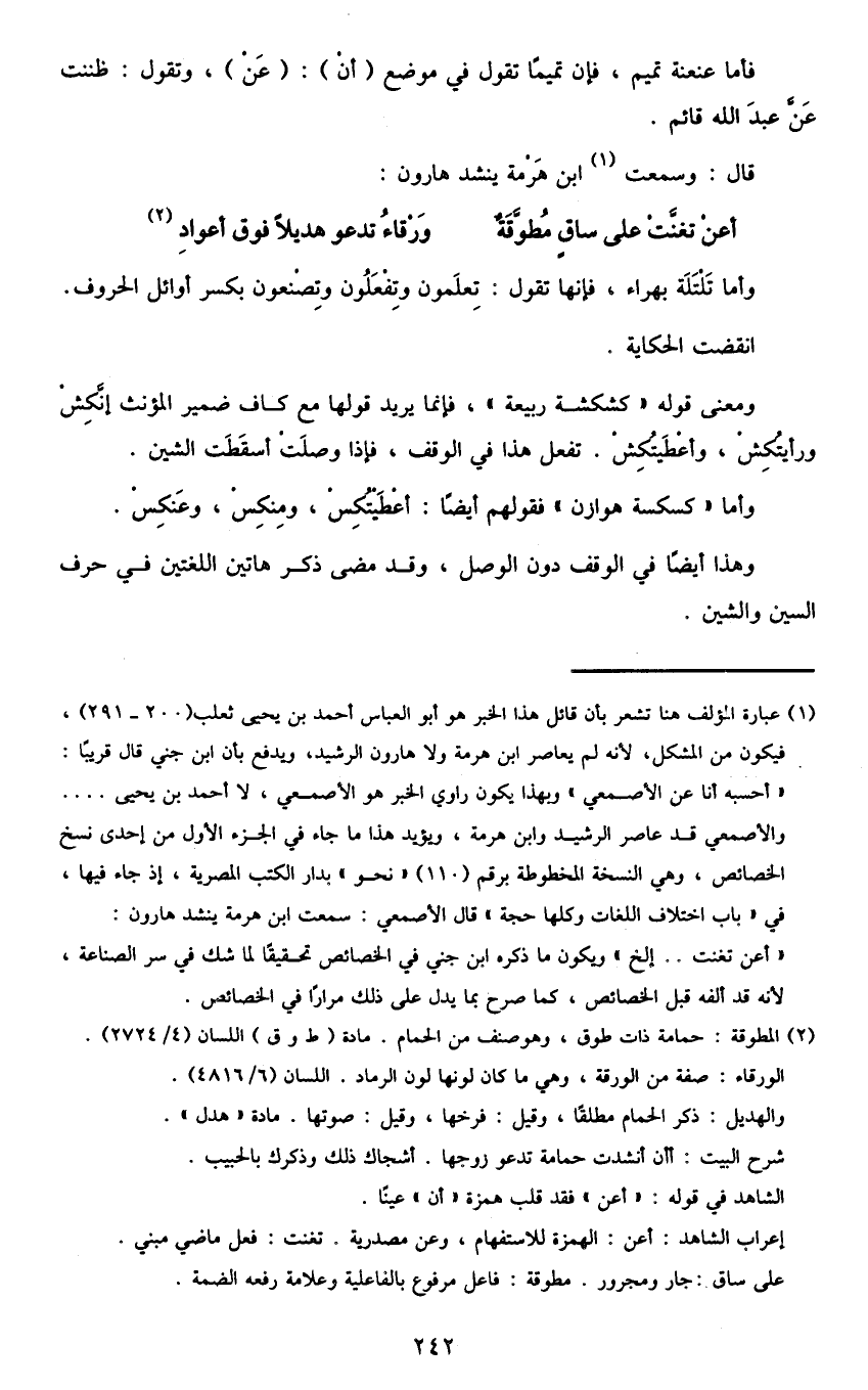 1 عبارة المؤلف هنا تشعر بأن قائل هذا الخبر هو أبو العباس أحمد بن يحيى ثعلب "200-291"، فيكون من المشكل، لأنه لم يعاصر ابن هرمة ولا هارون الرشيد، ويدفع بأن ابن جني قال قريبا: "أحسبه أنا عن الأصمعي" وبهذا يكون راوي الخبر هو الأصمعي، لا أحمد بن يحيى ... والأصمعي قد عاصر الرشيد وابن هرمة، ويؤيد هذا ما جاء في الجزء الأول من إحدى نسخ الخصائص، وهي النسخة المخطوطة برقم "110" "نحو" بدار الكتب المصرية، إذا جاء فيها، في "باب اختلاف اللغات وكلها حجة" قال الأصمعي: سمعت ابن هرمة ينشد هارون: