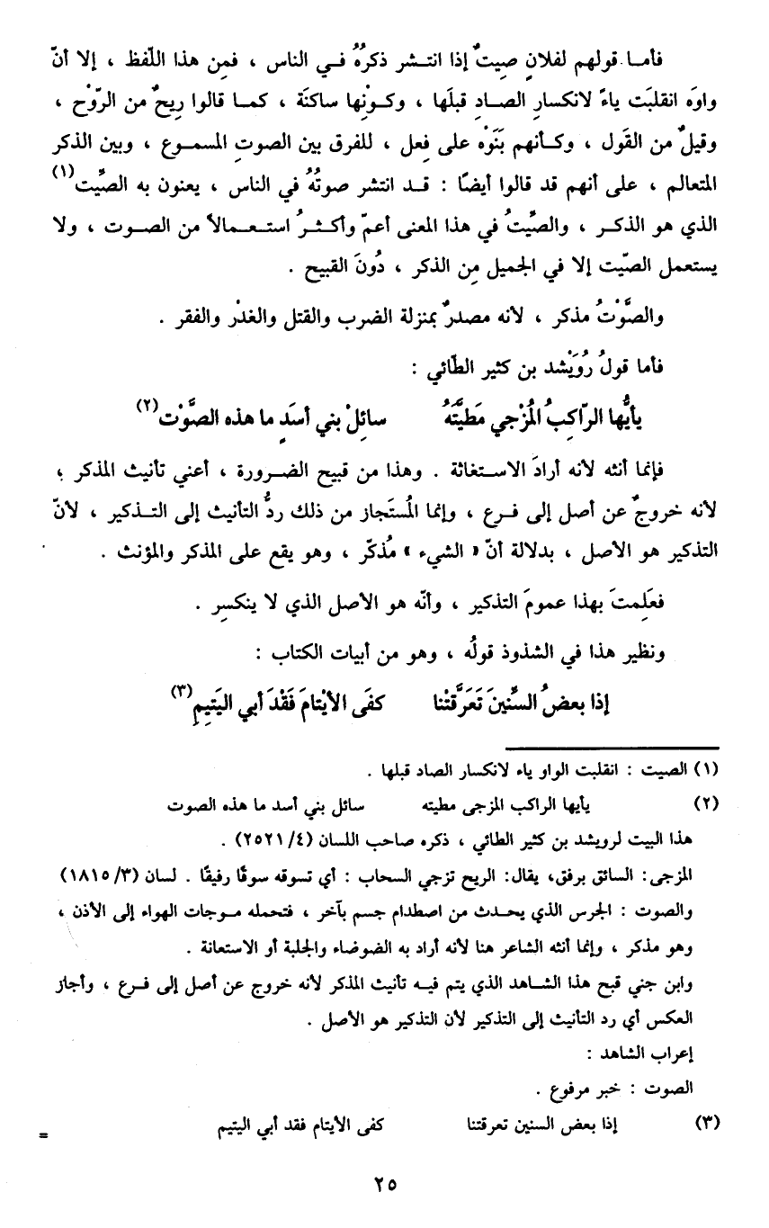 وابن جني قبح هذا الشاهد الذي يتم فيه تأنيث المذكر لأنه خروج عن أصل إلى فرع، وأجاز العكس أي رد التأنيث إلى التذكير لأن التذكير هو الأصل.