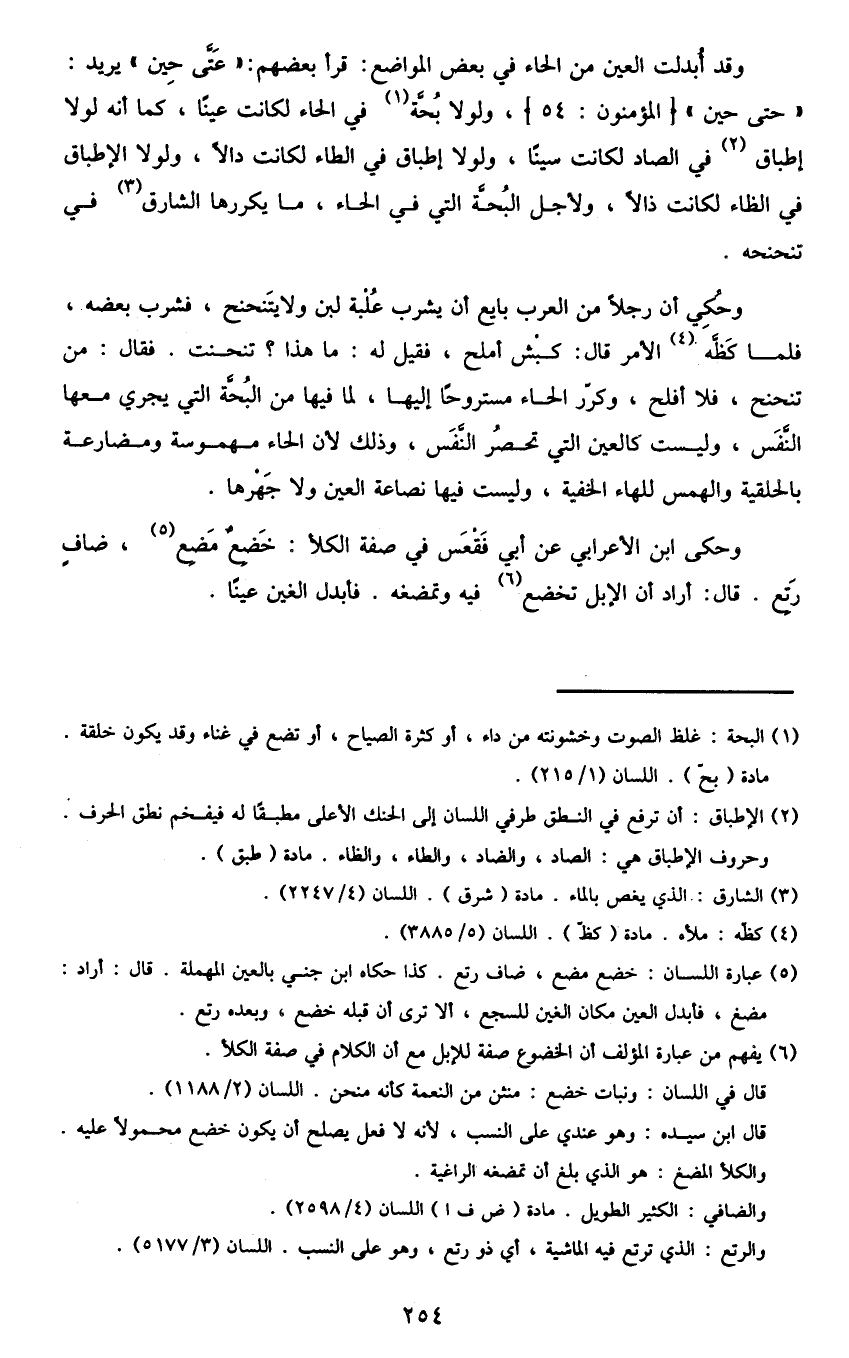 وقد أبدلت العين من الحاء في بعض المواضع: قرأ بعضهم: "عتى حين" يريد: {حَتَّى حِين} [المؤمنون: 54] ، ولولا بحة1 في الحاء لكانت عينا، كما أنه لولا إطباق2 في الصاد لكانت سينا، ولولا إطباق في الطاء لكانت دالا، ولولا الإطباق في الظاء لكانت ذالا، ولأجل البحة التي في الحاء، ما يكررها الشارق3 في تنحنحه.