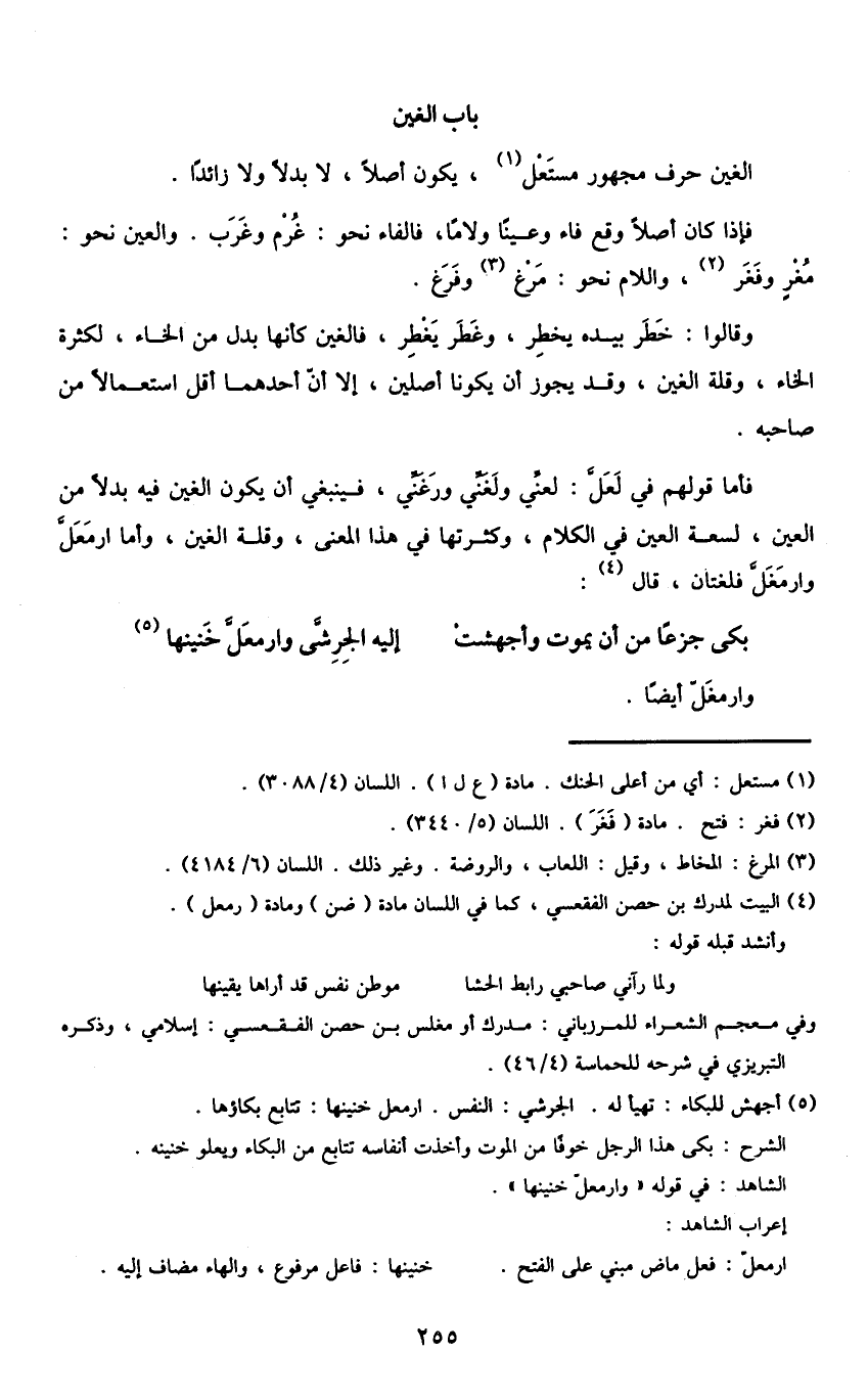 فأما قولهم في لعل: لعني ولغني ورغني، فينبغي أن يكون الغين فيه بدلا من العين، لسعة العين في الكلام، وكثرتها في هذا المعنى، وقلة الغين، وأما ارمعل وارمغل فلغتان، قال4:
