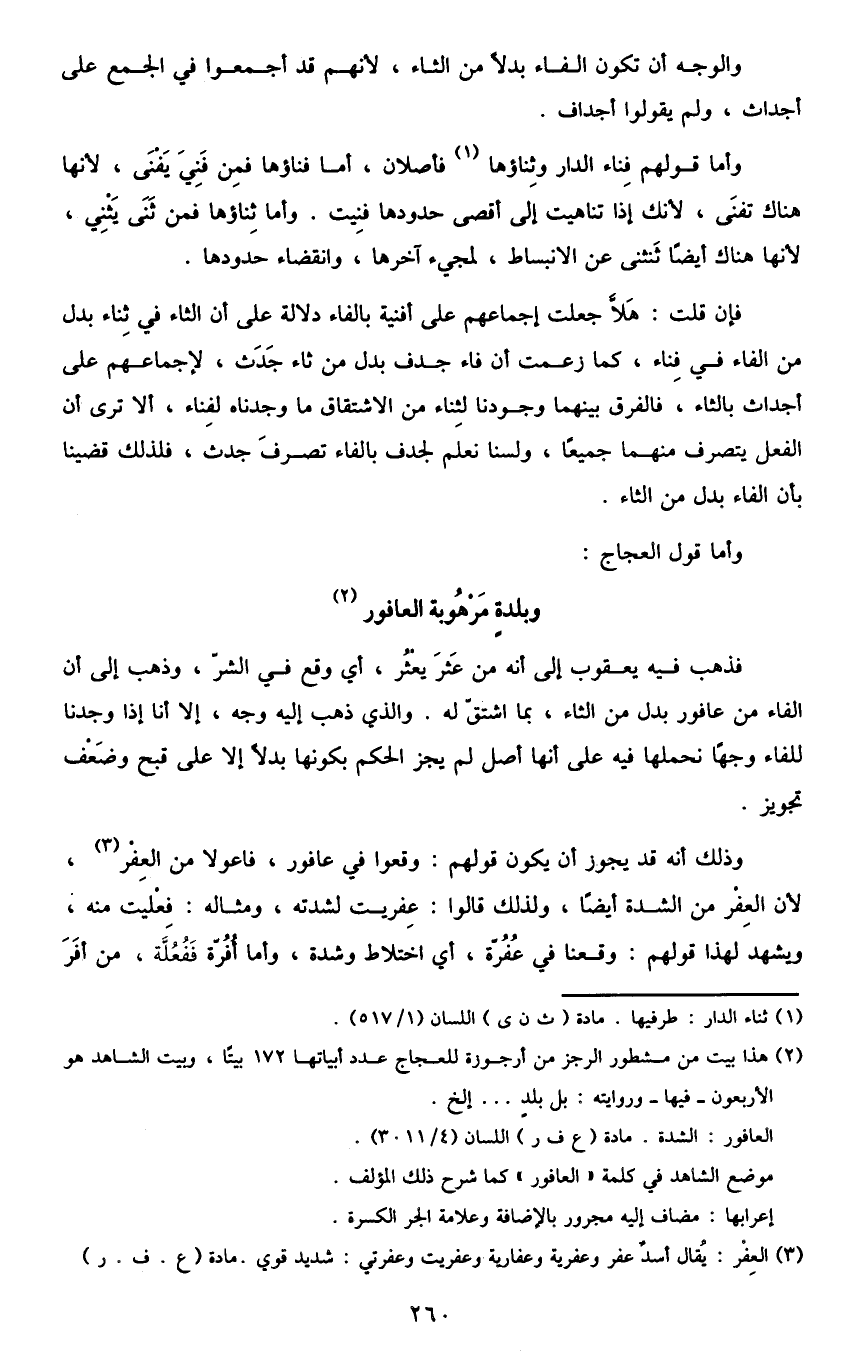 فذهب فيه يعقوب إلى أنه من عثر يعثر، أي وقع في الشر، وذهب إلى أن الفاء من عافور بدل من الثاء، بما اشتق له. والذي ذهب إليه وجه، إلا أنا إذا وجدنا للفاء وجها نحملها فيه على أنها أصل لم يجز الحكم بكونها بدلا إلا على قبح وضعف تجويز.
