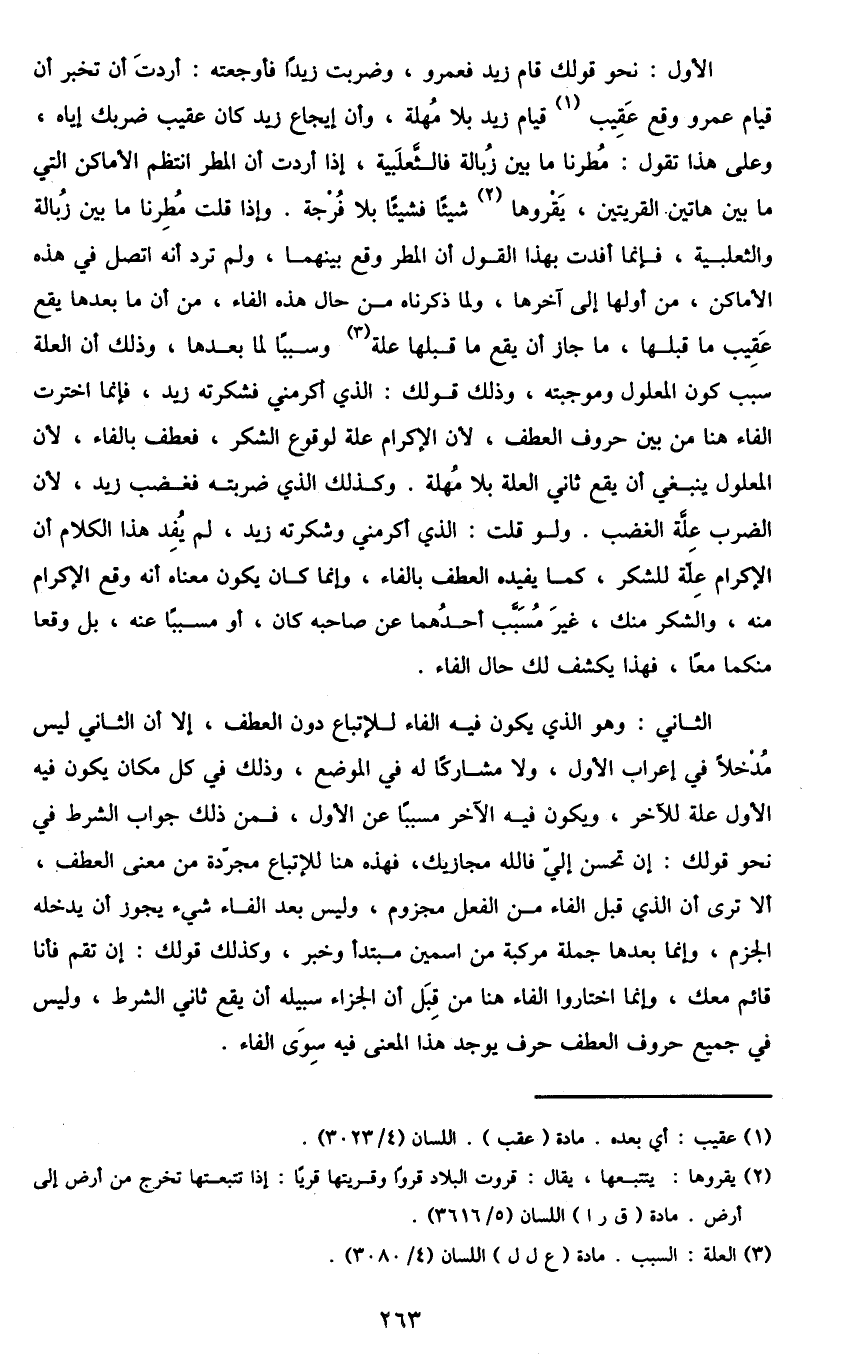 الأول: نحو قولك قام زيد فعمرو، وضربت زيدا فأوجعته: أردت أن تخبر أن قيام عمرو وقع عقيب1 قيام زيد بلا مهلة، وأن إيجاد زيد كان عقيب ضربك إياه، وعلى هذا تقول: مطرنا ما بين زبالة فالثعلبية، إذا أردت أن المطر انتظم الأماكن التي ما بين هاتين القريتين، يقروها2 شيئا فشيئا بلا فرجة. وإذا قلت مطرنا ما بين زبالة والثعلبية، فإنما أفدت بهذا القول أن المطر وقع بينهما، ولم ترد أنه اتصل في هذه الأماكن، من أولها إلى آخرها، ولما ذكرناه من حال هذه الفاء، من أن ما بعدها يقع عقيب ما قبلها، ما جاز أن يقع ما قبلها علة3 وسببا لما بعدها، وذلك أن العلة سبب كون المعلول وموجبته وذلك قولك: الذي أكرمني فشكرته زيد، فإنما اخترت الفاء هنا من بين حروف العطف، لأن الإكرام علة لوقوع الشكر، فعطف بالفاء، لأن المعلول ينبغي أن يقع ثاني العلة بلا مهلة. وكذلك الذي ضربته فغضب زيد، لأن الضرب علة الغضب. ولو قلت: الذي أكرمني وشكرته زيد، لم يفد هذا الكلام أن الإكرام علة للشكر، كما يفيده العطف بالفاء، وإنما كان يكون معناه أنه وقع الإكرام منه، والشكر منك، غير مسبب أحدهما عن صاحبه كان، أو مسببا عنه، بل وقعا منكما معا، فهذا يكشف لك حال الفاء.