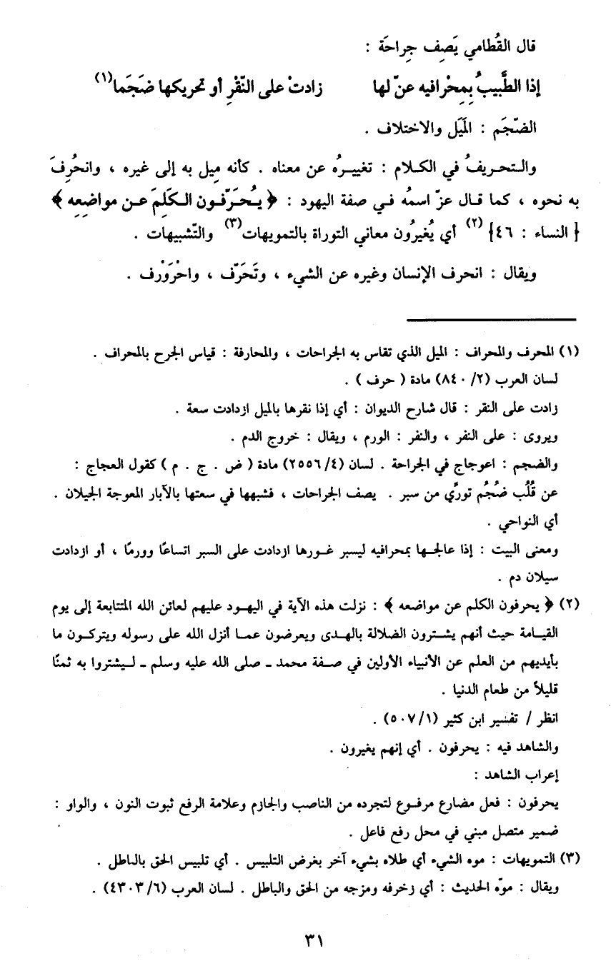 والتحريف في الكلام: تغييره عن معناه. كأنه ميل به إلى غيره، وانحرف به نحوه، كما قال عز اسمه في صفة اليهود: {يُحَرِّفُونَ الْكَلِمَ عَنْ مَوَاضِعِه} [النساء: 46] 2 أي يغيرون معاني التوراة بالتمويهات3 والتشبيهات.