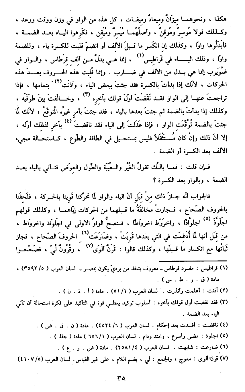 فالجواب أنه جاز ذلك من قبل أن الياء والواو لما تحركتا قويتا بالحركة، فلحقتا بالحروف الصحاح، فجازت مخالفة ما قبلهما من الحركات إياهما، وكذلك قولهم اجلوذ5 اجلواذا، واخروط اخرواطا، فتصح الواو الأولى في اجلواذ واخرواط، من قبل أنها لما أدغمت في التي بعدها قويت، وضارعت6 الحروف الصحاح، فجاز ثباتها مع انكسار ما قبلها، وكذلك قالوا: قرن ألوى7، وقرون لي، فصححوا