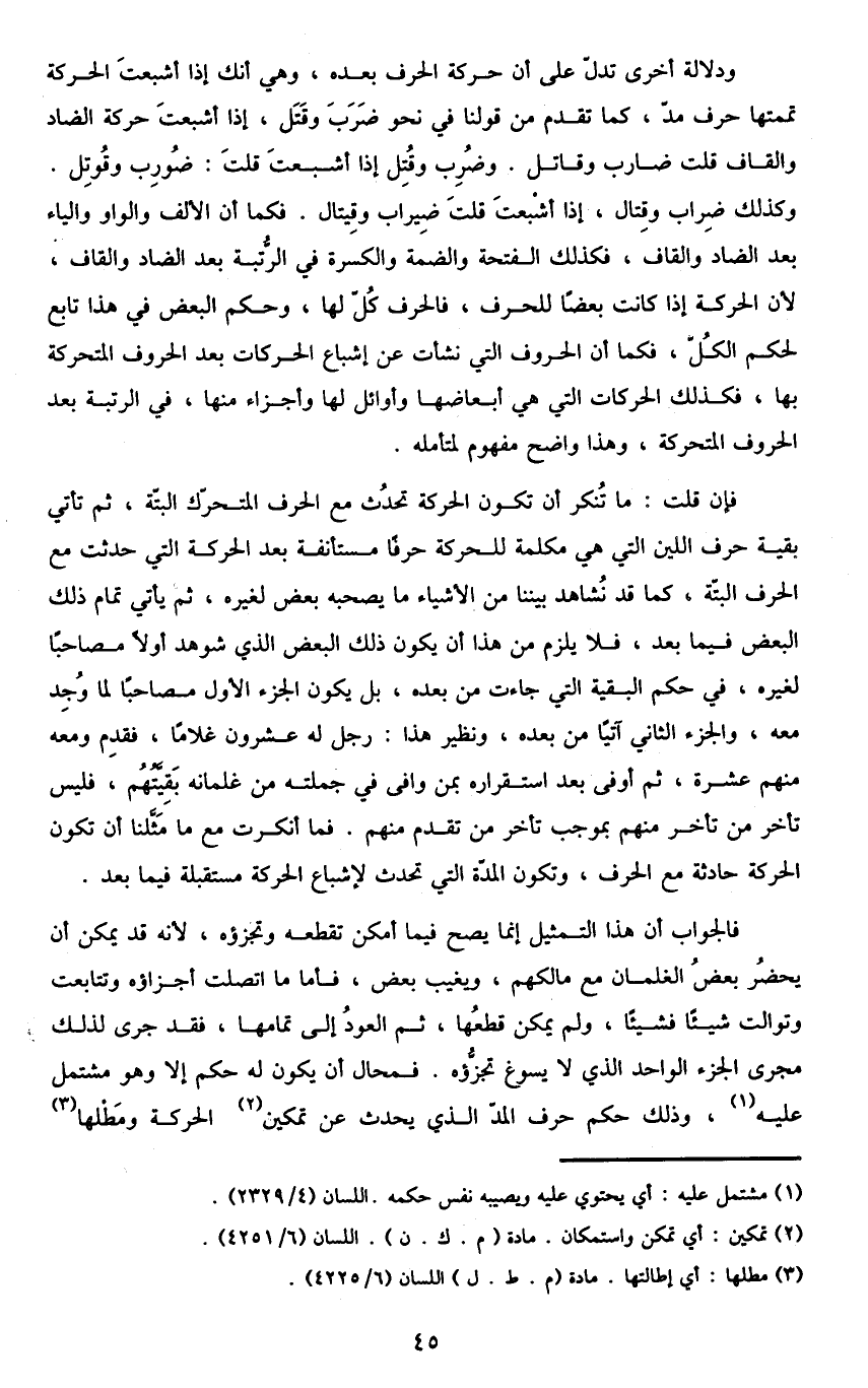 فإن قلت: ما تنكر أن تكون الحركة تحدث مع الحرف المتحرك البتة، ثم تأتي بقية حروف اللين التي هي مكملة للحركة حرفا مستأنفة بعد الحركة التي حدثت مع الحرف البتة، كما قد نشاهد بينا من الأشياء ما يصحبه بعض لغيره، ثم يأتي تمام ذلك البعض فيما بعد، فلا يلزم من هذا أن يكون ذلك البعض الذي شوهد أو مصاحبا لغيره، في حكم البقية التي جاءت من بعده، بل يكون الجزء الأول مصاحبا لما وجد معه، والجزء الثاني آتيا من بعده، ونظير هذا: رجل له عشرون غلاما، فقدم ومعه منهم عشرة، ثم أوفى بعد استقراره بمن وافى في جملته من غلمانه بقيتهم، فليس تأخر من تأخر منهم بموجب تأخر من تقدم منهم، فما أنكرت مع ما مثلنا أن تكون الحركة حادثة مع الحرف، وتكون المدة التي تحدث لإشباع الحركة مستقبلة فيما بعد.