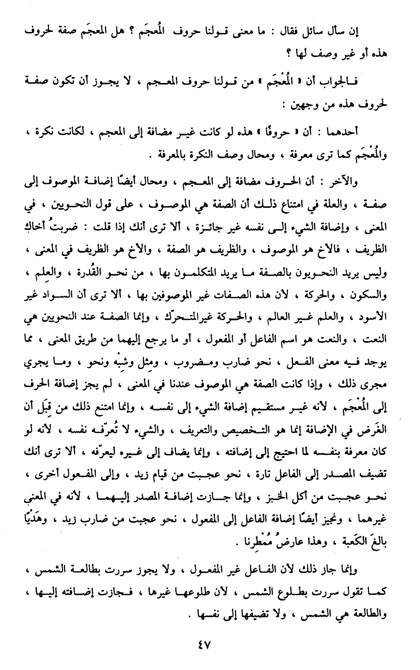 والآخر: أن الحروف مضافة إلى المعجم، ومحال أيضا إضافة الموصوف إلى صفة، والعلة في امتناع ذلك أن الصفة هي الموصوف، على قول النحويين، في المعنى، وإضافة الشيء إلى نفسه غير جائزة، ألا ترى أنك إذا قلت: ضربت أخاك الظريف، فالأخ هو الموصوف، والظريف هو الصفة، والأخ هو الظريف في المعنى وليس يريد النحويين بالصفة ما يريد المتكلمون بها، من نحو القدرة، والعلم، والسكون والحركة، لأن هذه الصفات غير الموصوفين بها، ألا ترى أن السواد غير الأسود، والعلم غير العالم، والحركة غير المتحرك، وإنما الصفة عند النحويين هي النعت، والنعت هو اسم الفاعل أو المفعول، أو ما يرجع إليهما من طريق المعنى، مما يوجد فيه معنى الفعل، نحو ضارب ومضروب، ومثل وشبه ونحو، وما يجري مجرى ذلك، وإذا كانت الصفة هي الموصوف عندنا في المعنى، لم يجز إضافة الحرف إلى المعجم، لأنه غير مستقيم إضافة الشيء إلى نفسه، وإنما امتنع ذلك من قبل أن الغرض في الإضافة إنما هو التخصيص والتعريف، والشيء لا تعرفه نفسه، لأنه لو كان معرفة بنفسه لما احتيج إلى إضافته، وإنما يضاف إلى غيره ليعرفه، ألا ترى أنك تضيف المصدر إلى الفاعل تارة، نحو عجبت من قيام زيد، وإلى المفعول أخرى، نحو عجبت من أكل الخبز، وإنما جازت إضافة المصدر إليهما، لأنه في المعني غيرهما، ونجيز أيضا إضافة الفاعل إلى المفعول، نحو عجبت من ضارب زيد، {هَدْيًا بَالِغَ الْكَعْبَةَ} و {هَذَا عَارِضٌ مُمْطِرُنَا} .
