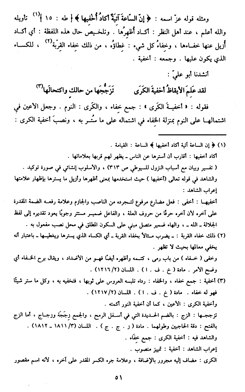 ومثله قوله عز اسمه: {إِنَّ السَّاعَةَ آتِيَةٌ أَكَادُ أُخْفِيهَا} [طه: 15] 1 تأويله والله أعلم، عند أهل النظر: أكاد أظهرها، وتلخيص حال هذه اللفظة: أي أكاد أزيل عنها خفاءها، وخفاء كل شيء: غطاؤه، من ذلك خفاء القربة2، للكساء الذي يكون عليها. وجمعه: أخفية.