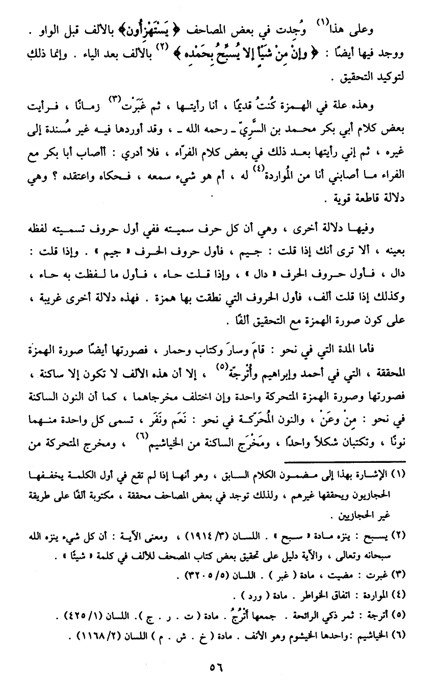 1 الإشارة بهذا إلى مضمون الكلام السابق، وهو أنها إذا لم تقع في أول الكلمة يخففها الحجازيون ويحققها غيرهم، ولذلك توجد في بعض المصاحف محققة، مكتوبة ألفا على طريقة غير الحجازيين.