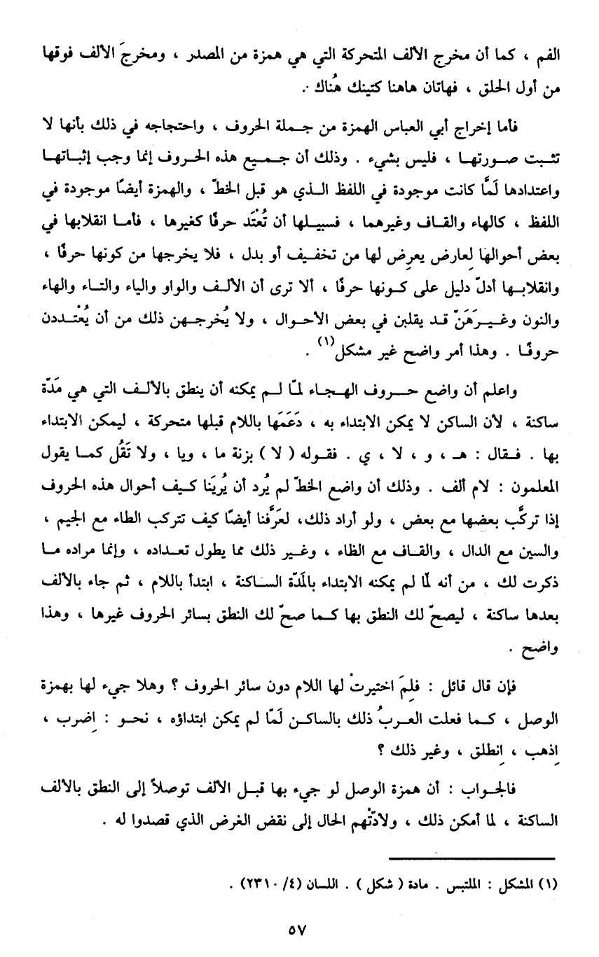 فأما إخراج أبي العباس الهمزة من جملة الحروف، واحتجاجه في ذلك بأنها لا تثبت صورتها، فليس بشيء، وذلك أن جميع هذه الحروف إنما وجب إثباتها واعتدادها لما كانت موجودة في اللفظ الذي هو قبل الخط، والهمزة أيضا موجودة في اللفظ، كالهاء والقاف وغيرهما، فسبيلها أن تعتد حرفا كغيرها، فأما انقلابها في بعض أحوالها لعارض يعرض لها من تخفيف أو بدل، فلا يخرجها من كونها حرفا، وانقلابها أدل دليل على كونها حرفا، ألا ترى أن الألف والواو والياء والتاء والهاء والنون وغيرهن قد يقلبن في بعض الأحوال، ولا يخرجهن ذلك من أن يعتددن حروفا، وهذ أمر وضح غير مشكل1.