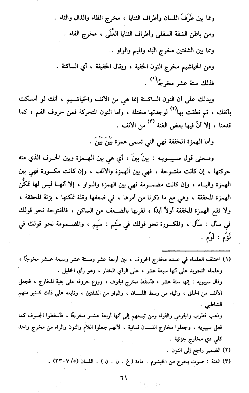 1 اختلف العلماء في عدد مخارج الحروف، بين أربعة عشر وستة عشر وسبعة عشر مخرجا، وعلماء التجويد على أنها سبعة عشر، على الرأي المختار، وهو رأي الخليل.
