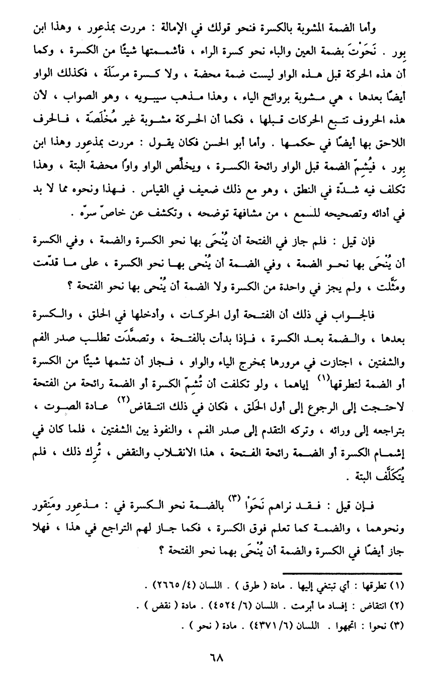 فإن قيل: فقد نراهم نحوا3 بالضمة نَحو الكسرة في: مذعور ومنقور ونحوهما، والضمة كما تعلم فوق الكسرة، فكما جاز لهم التراجع في هذا، فهلا جاز أيضا في الكسرة والضمة أن ينحى بهما نحو الفتحة؟