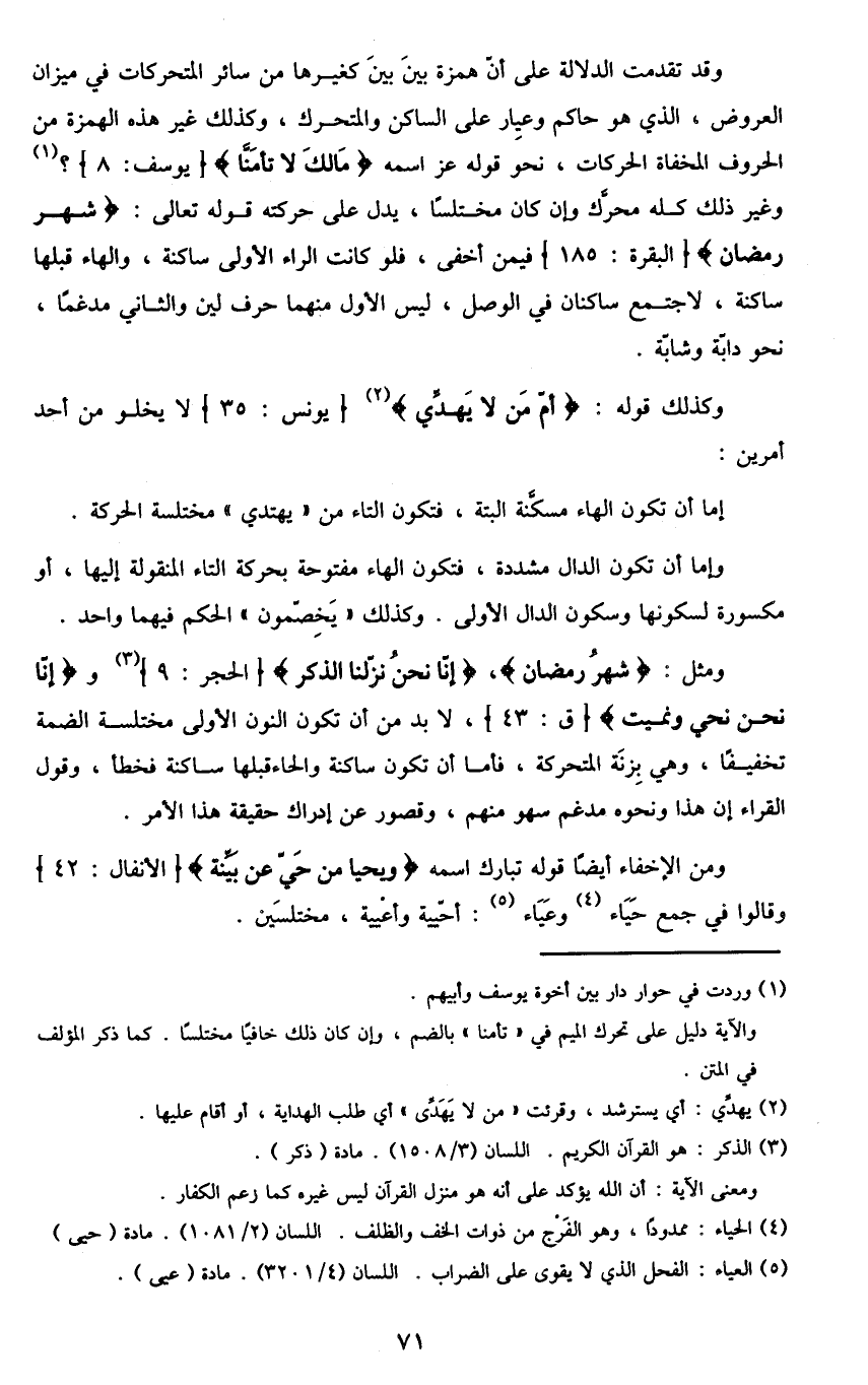 ومثل: {شَهْرُ رَمَضَان} ، {إِنَّا نَحْنُ نَزَّلْنَا الذِّكْر} [الحجر: 9] 3 و {إِنَّا نَحْنُ نُحْيِي وَنُمِيت} [ق: 43] ، لا بد من أن تكون النون الأولى مختلسة الضمة تخفيفا، وهي بزنة المتحركة، فأما أن تكون ساكنة والحاء قبلها ساكنة فخطأ، وقول القراء إن هذا ونحوه مدغم سو منهم، وقصور عن إدراك حقيقة هذا الأمر.
