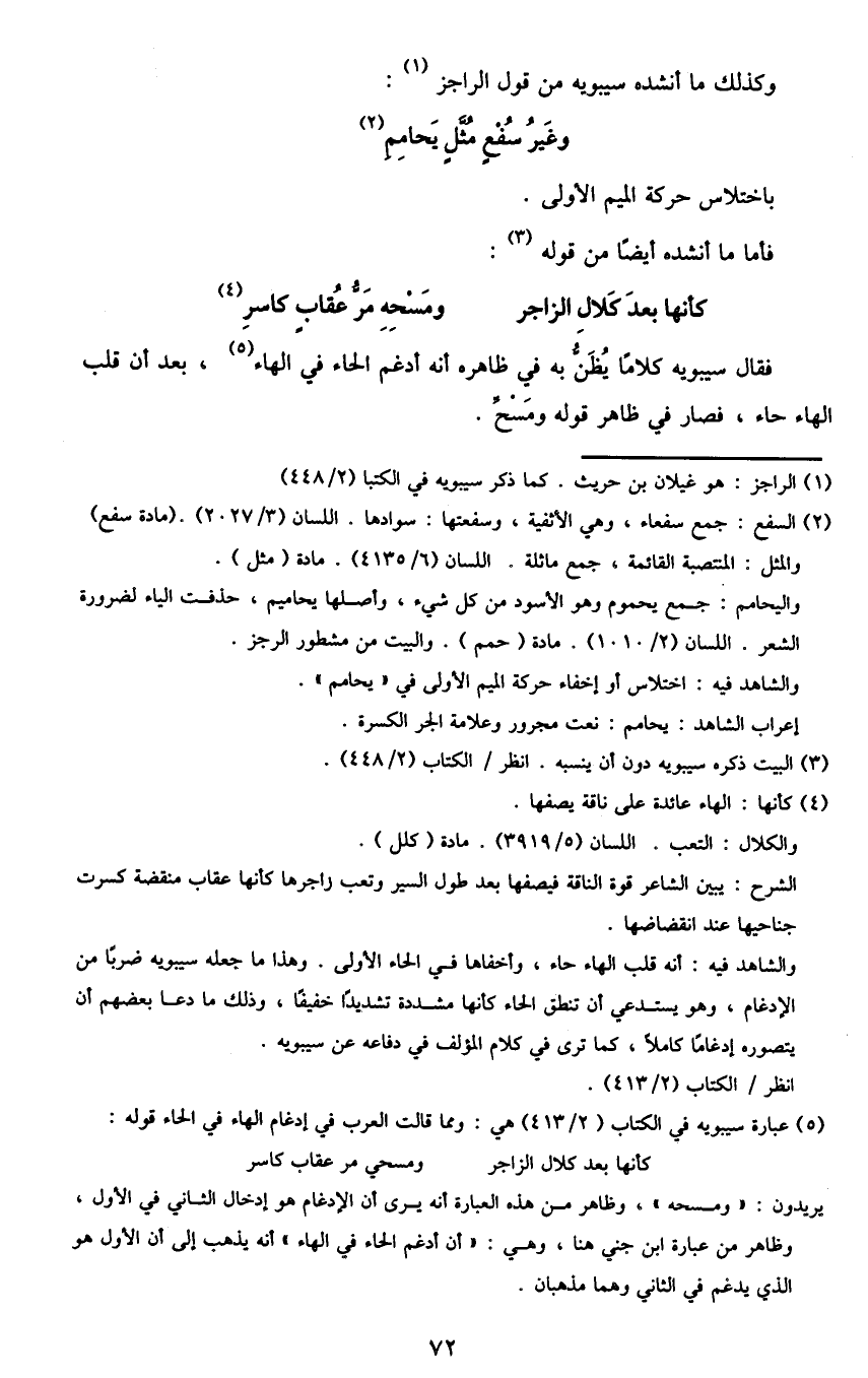 5 عبارة سيبويه في الكتاب "2/ 413" هي: ومما قالت العرب في إدغام الهاء في الحاء قوله:
