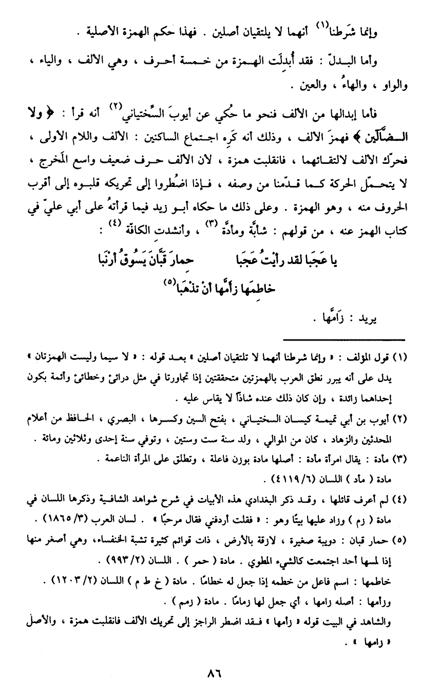 1 قول المؤلف: "وإنما شرطنا أنهما لا تلتقيان أصلين" بعد قوله: "لا سيما وليست الهمزتان" يدل على أنه يبرر نطق العرب بالهمزتين متحققتين إذا تجاورتا في مثل درائئ وخطائئ وأئمة بكون إحداهما زائدة، وإن كان ذلك عنده شاذا لا يقاس عليه.