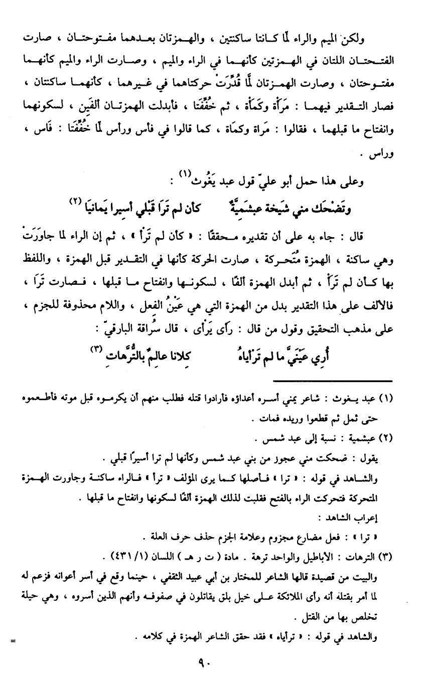 قال: جاء به على أن تقديره محققا: "كأن لم ترأ"، ثم إن الراء لما جاورت وهي ساكنة، الهمزة متحركة، صارت الحركة كأنها في التقدير قبل الهمزة، واللفظ بها كأن لم ترأ، ثم أبدل الهمزة ألفا، لسكونها وانفتاح ما قبلها، فصارت ترا، فالألف على هذا التقدير بدل من الهمزة التي هي عين الفعل، واللام محذوفة للجزم، على مذهب التحقيق وقول من قال: رأى يرأى، قال سراقة البارقي: