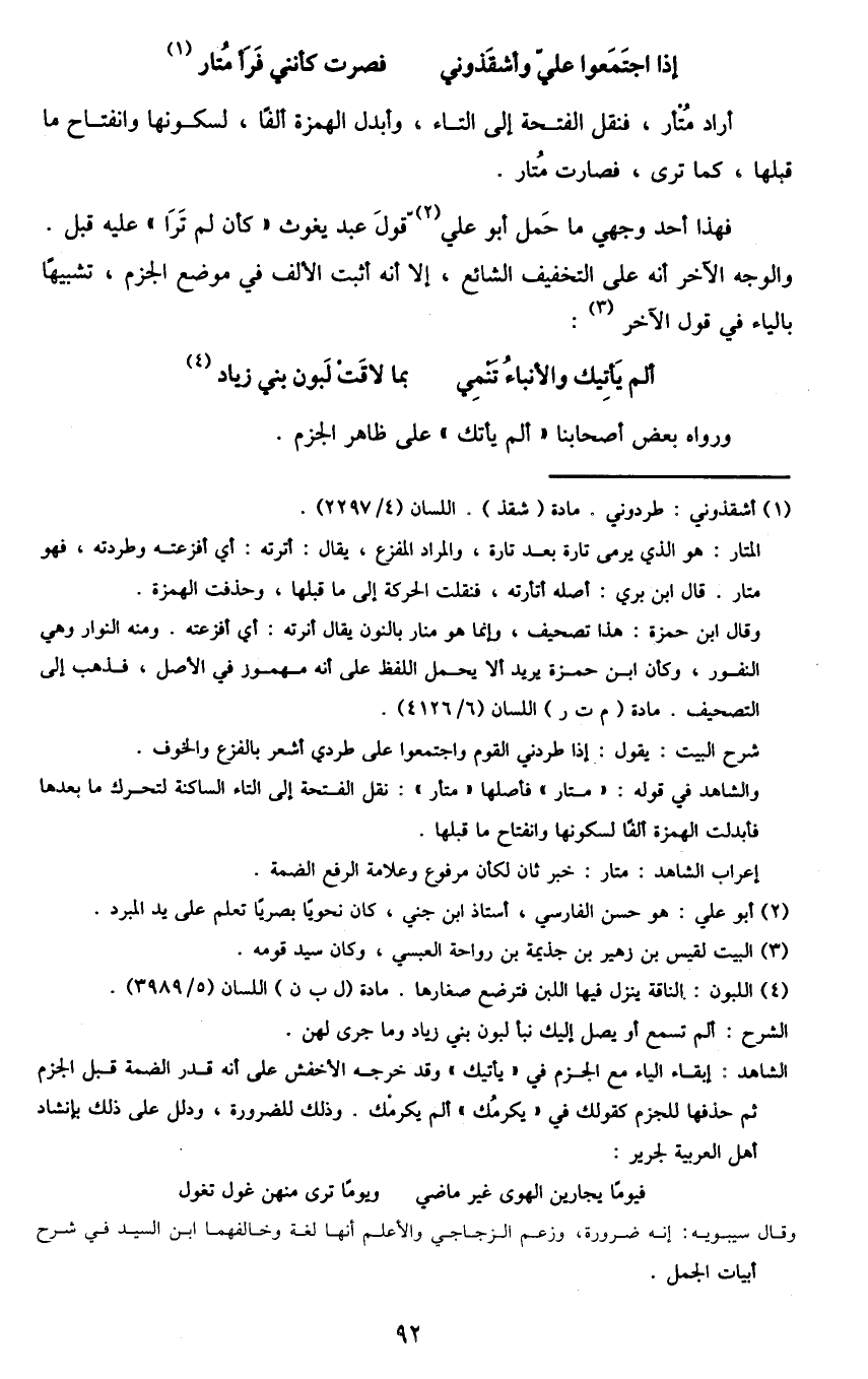 وقال سيبويه: إنه ضرورة، وزعم الزجاجي والأعلم أنها لغة وخالفهما ابن السيد في شرح أبيات الجمل.