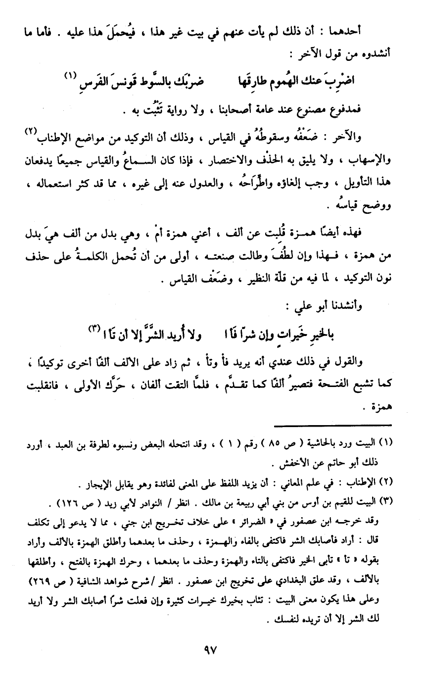 والآخر: ضعفه وسقوطه في القياس، وذلك أن التوكيد من مواضع الإطناب2 والإسهاب، ولا يليق به الحذف والاختصار، فإذا كان السماع والقياس جميعا يدفعان هذا التأويل، وجب إلغاؤه وإطراحه، والعدول عنه إلى غيره، مما قد كثر استعماله، ووضح قياسه.
