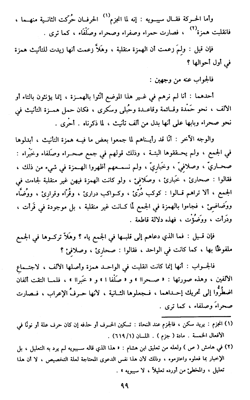 وأما الحركة فقال سيبويه: إنه لما انجزم1 الحرفان حركت الثانية منهما، فانقلبت همزة2، فصارت حمراء وصفراء وصحراء وصلفاء، كما ترى.