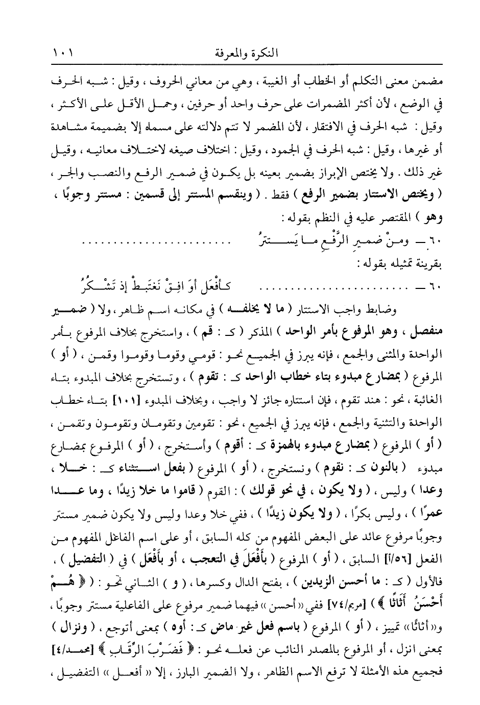 مضمن معنى التكلم أو الخطاب أو الغيبة، وهي من معاني الحروف، وقيل: شبه الحرف في الوضع؛ لأن أكثر المضمرات على حرف واحد أو حرفين، وحمل الأقل على الأكثر، وقيل: شبه الحرف في الافتقار؛ لأن المضمر لا تتم دلالته على مسماه إلا بضميمة مشاهدة أو غيرها، وقيل: شبه الحرف في الجمود، وقيل: اختلاف صيغه لاختلاف معانيه، وقيل غير ذلك. ولا يختص الإبراز بضمير بعينه بل يكون في ضمير الرفع والنصب والجر، "ويختص الاستتار بضمير الرفع" فقط. "وينقسم المستتر إلى قسمين: مستتر وجوبا، وهو" المقتصر عليه في النظم بقوله: