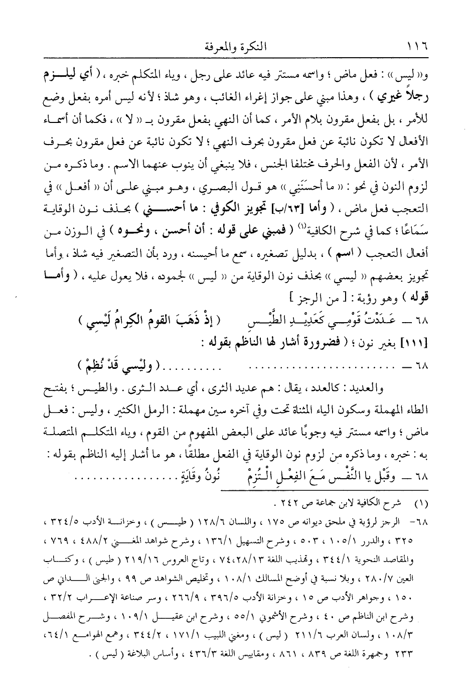 و"ليس": فعل ماض؛ واسمه مستتر فيه عائد على رجل، وياء المتكلم خبره، "أي: ليلزم رجلا غيري"، وهذا مبني على جواز إغراء الغائب، وهو شاذ؛ لأنه ليس أمره بفعل وضع للأمر، بل بفعل مقرون بلام الأمر، كما أن النهي بفعل مقرون بـ"لا"، فكما أن أسماء الأفعال لا تكون نائبة عن فعل مقرون بحرف النهي؛ لا تكون نائبة عن فعل مقرون بحرف الأمر؛ لأن الفعل والحرف مختلفا الجنس، فلا ينبغي أن ينوب عنهما الاسم، وما ذكره من لزوم النون في نحو: "ما أحسنني" هو قول البصري، وهو مبني على أن "أفعل" في التعجب فعل ماض، "وأما تجويز الكوفي: ما أحسني" بحذف نون الوقاية سماعا؛ كما في شرح الكافية1 "فمبني على قوله: أن أحسن، ونحوه" في الوزن من أفعال التعجب "اسم"، بدليل تصغيره، سمع ما أحيسنه، ورد بأن التصغير فيه شاذ، وأما تجويز بعضهم "ليس" بحذف نون الوقاية من "ليس" لجموده، فلا يعول عليه، "وأما قوله" وهو رؤبة: [من الرجز]