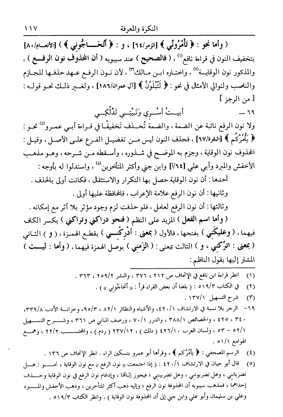 5 قال أبو حيان في الارتشاف 1/ 420: "إذا اجتمعت "نون الرفع" مع نون الوقاية، نحو: هل تضربانني، وهل تضربونني، وهل تضربينني؛ فيجوز إثباتها، وإدغام نون الرفع في نون الوقاية وحذف إحداهما، فمذهب سيبويه أن المحذوفة نون الرفع؛ وإليه ذهب أكثر المتأخرين، وذهب الأخفش والمبرد وعلي بن سليمان وأبو علي وابن جني إلى أن المحذوفة نون الوقاية". وانظر الكتاب 3/ 519.